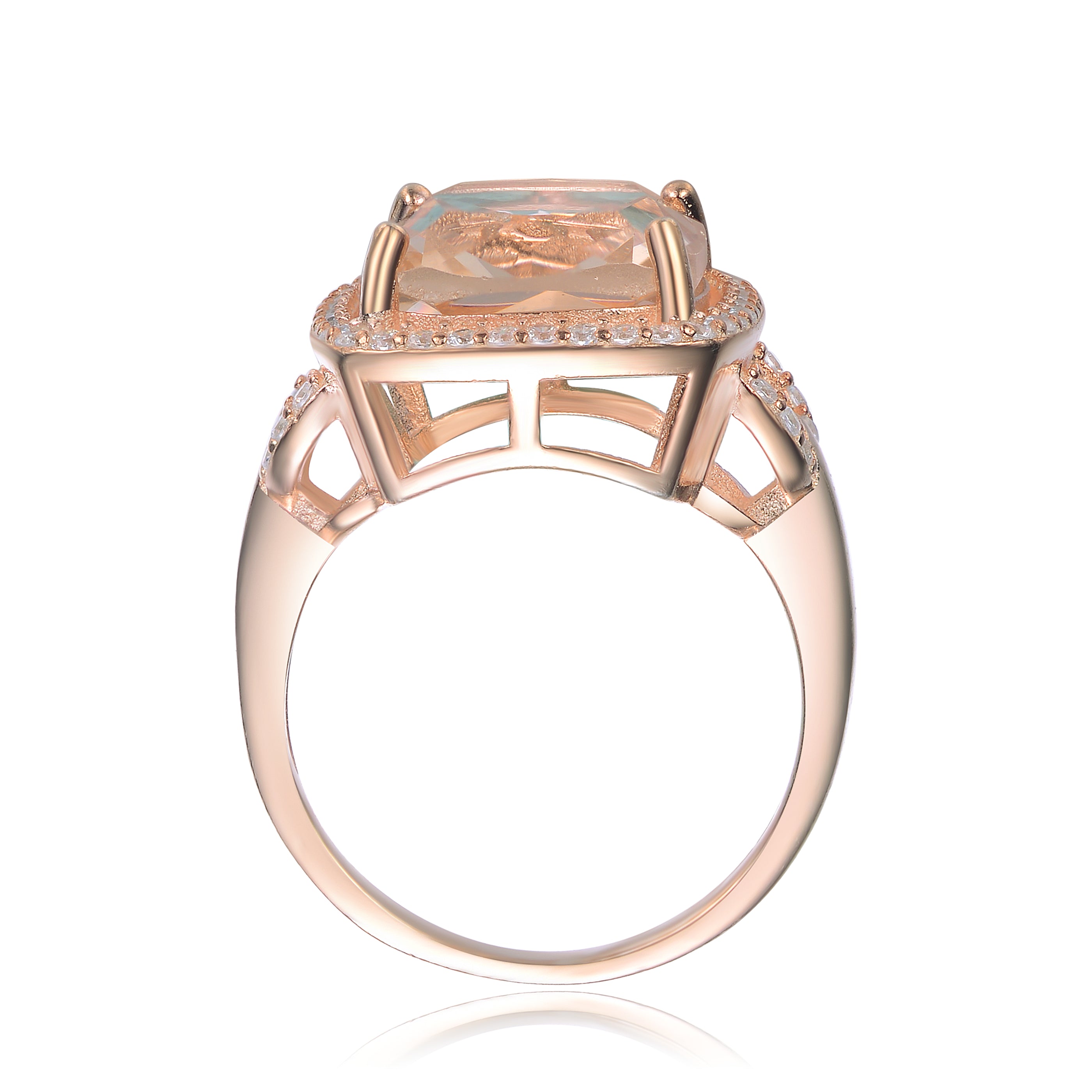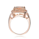 This elegant cocktail ring features a radiant morganite cubic zirconia at its center. Clear cubic zirconia accents frame the square setting for added brilliance. Crafted in rose gold plated sterling silver, it offers a warm and polished finish. The structured silhouette enhances its refined appearance. This ring is ideal for sophisticated statement styling.