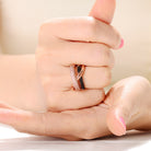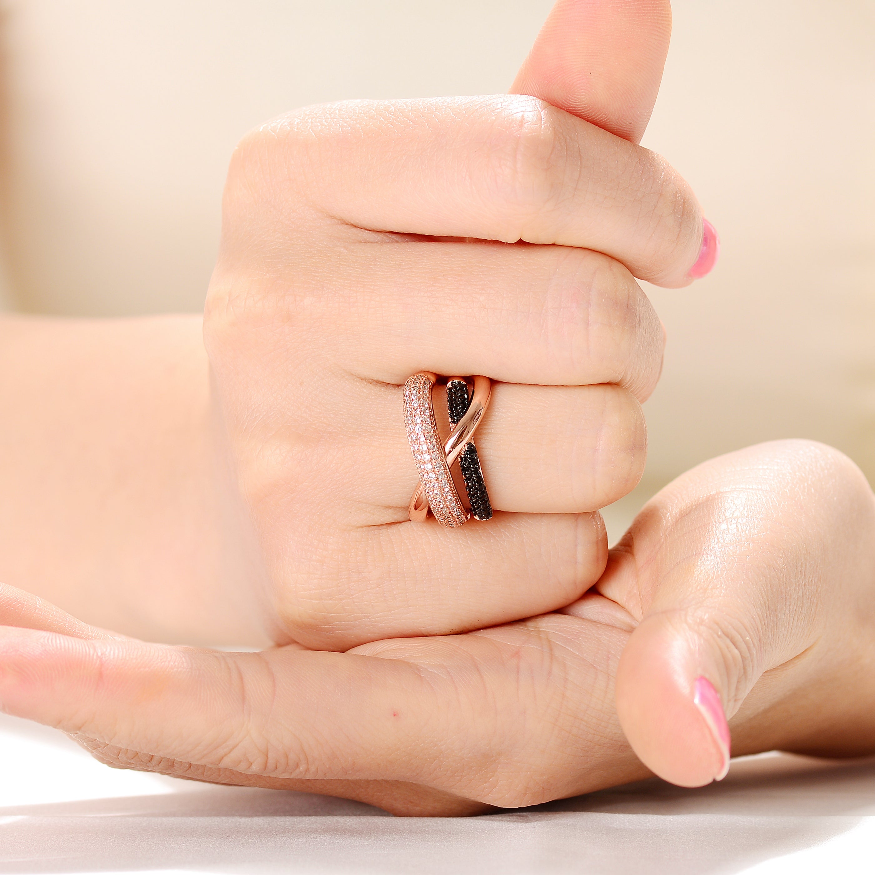 This distinctive interlocked ring blends black and clear cubic zirconia stones for bold contrast. The two-tone finish enhances the layered design with modern edge. Crafted from sterling silver, it offers durability with striking visual appeal. The interwoven structure creates depth and movement. Ideal for fashion-forward styling, it stands out without overwhelming. This ring is a confident statement of contemporary elegance.