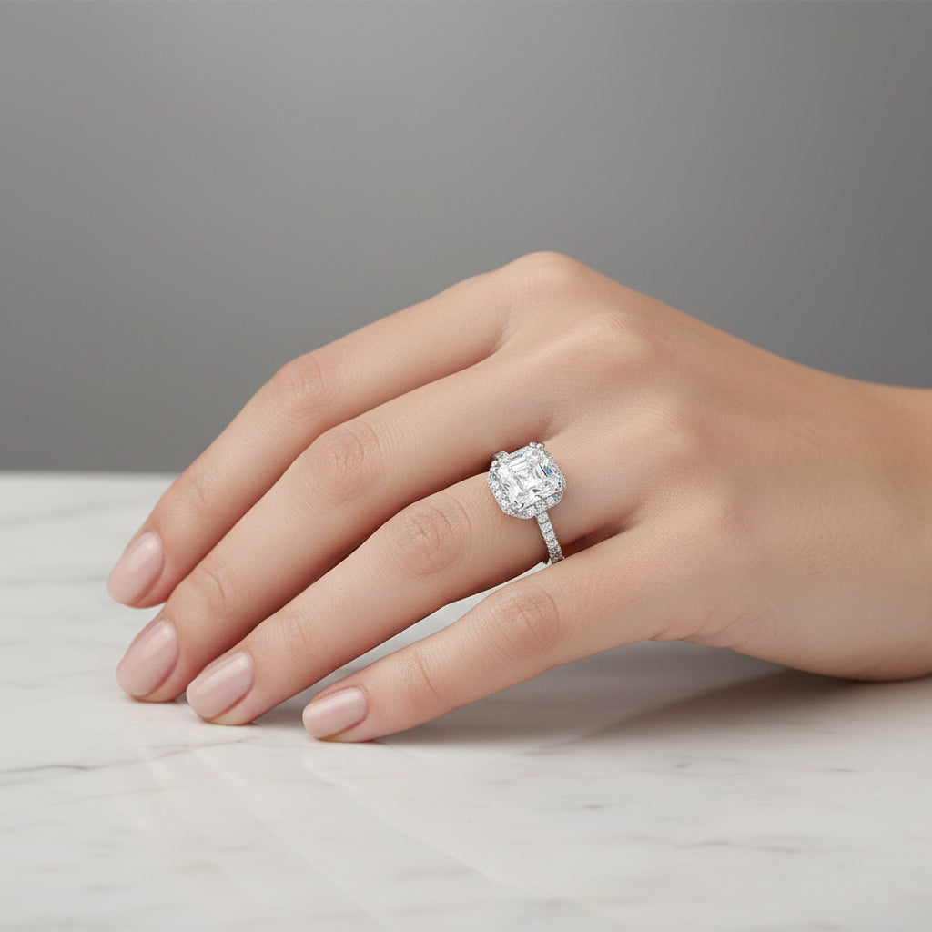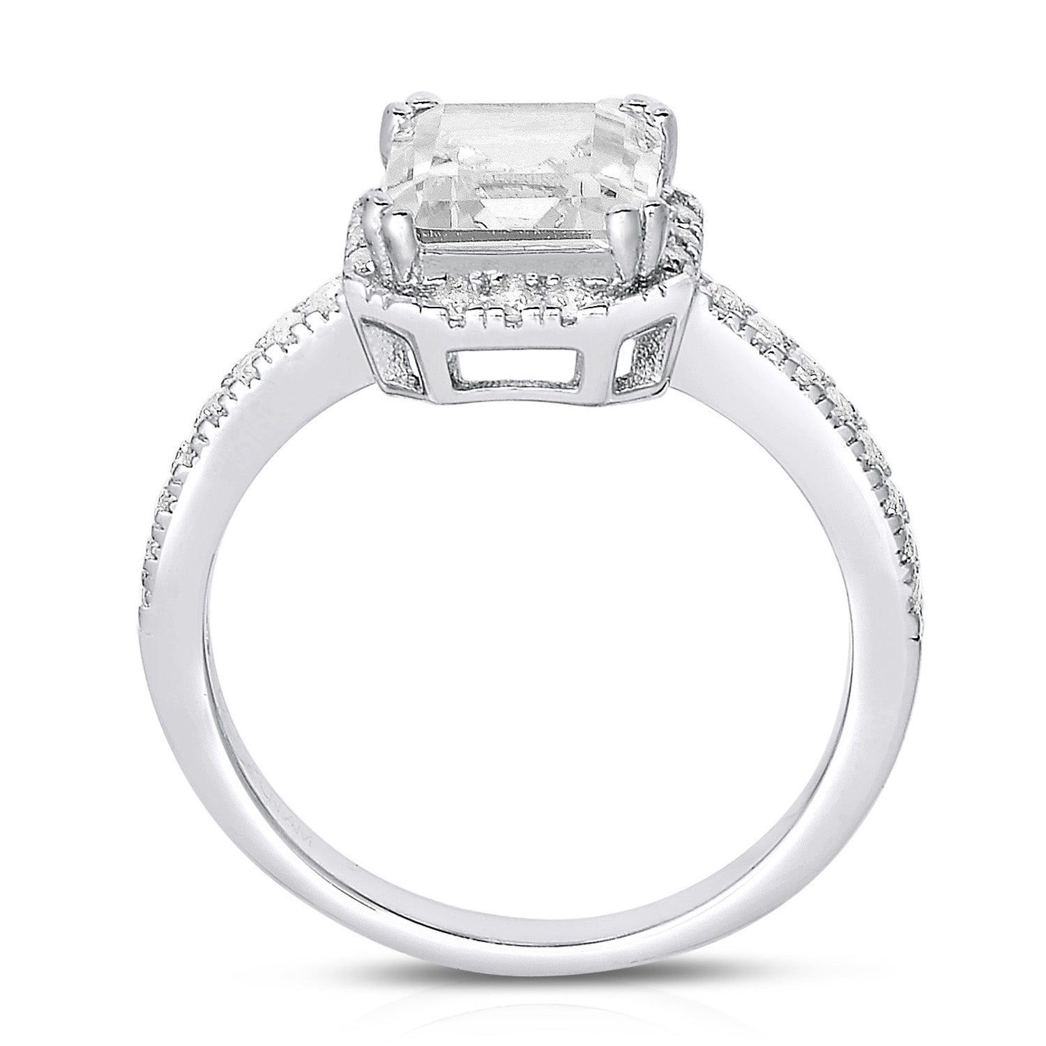 This striking ring features a bold Asscher-cut cubic zirconia centerpiece. A surrounding halo of round stones enhances its brilliance and depth. Crafted in white gold plated sterling silver, it delivers high-impact shine. The structured silhouette adds confident elegance to any look. Designed to stand out without overpowering. A statement ring with polished sophistication.