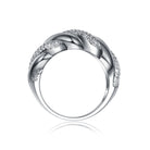 This elegant twisted ring features two intertwined bands for a fluid, modern look. One strand is polished smooth, while the other sparkles with pavé-set cubic zirconia stones. Crafted in sterling silver and finished with white gold plating, it delivers refined shine. The wavy silhouette adds movement and dimension. Comfortable enough for everyday wear, it transitions easily from casual to dressy. A chic ring that adds subtle glamour to any outfit.