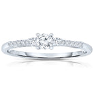 This elegant ring is crafted from .925 sterling silver and showcases a brilliant round-cut cubic zirconia at the center for eye-catching sparkle. The center stone is beautifully complemented by rows of smaller clear round cubic zirconia along each side of the band, adding refined shimmer and balance. Finished with a sleek rhodium plating, this timeless design offers classic elegance with a modern touch.