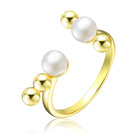 Stylish .925 Sterling silver gold plated 5mm fresh water pearl ring. This ring features unique open shape made out of two gold beads on each side. On the one side the gold beads are set vertically one next to the other ending with 5mm freshwater pearl and on the other side, the pearl is in the center. Crafted of .925 Sterling silver with gold plating and it is available in sizes 6,7, 8.