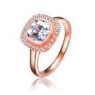 Classy .925 Sterling silver rose gold plated cubic zirconia square Modern ring. This ring features cushion clear cubic zirconia stone set in the center of the square frame, accented by small clear round cubic zirconia stones haloed on the outer square frame. Crafted of .925 Sterling silver with rose gold plating and it is available in sizes 6, 7, 8.