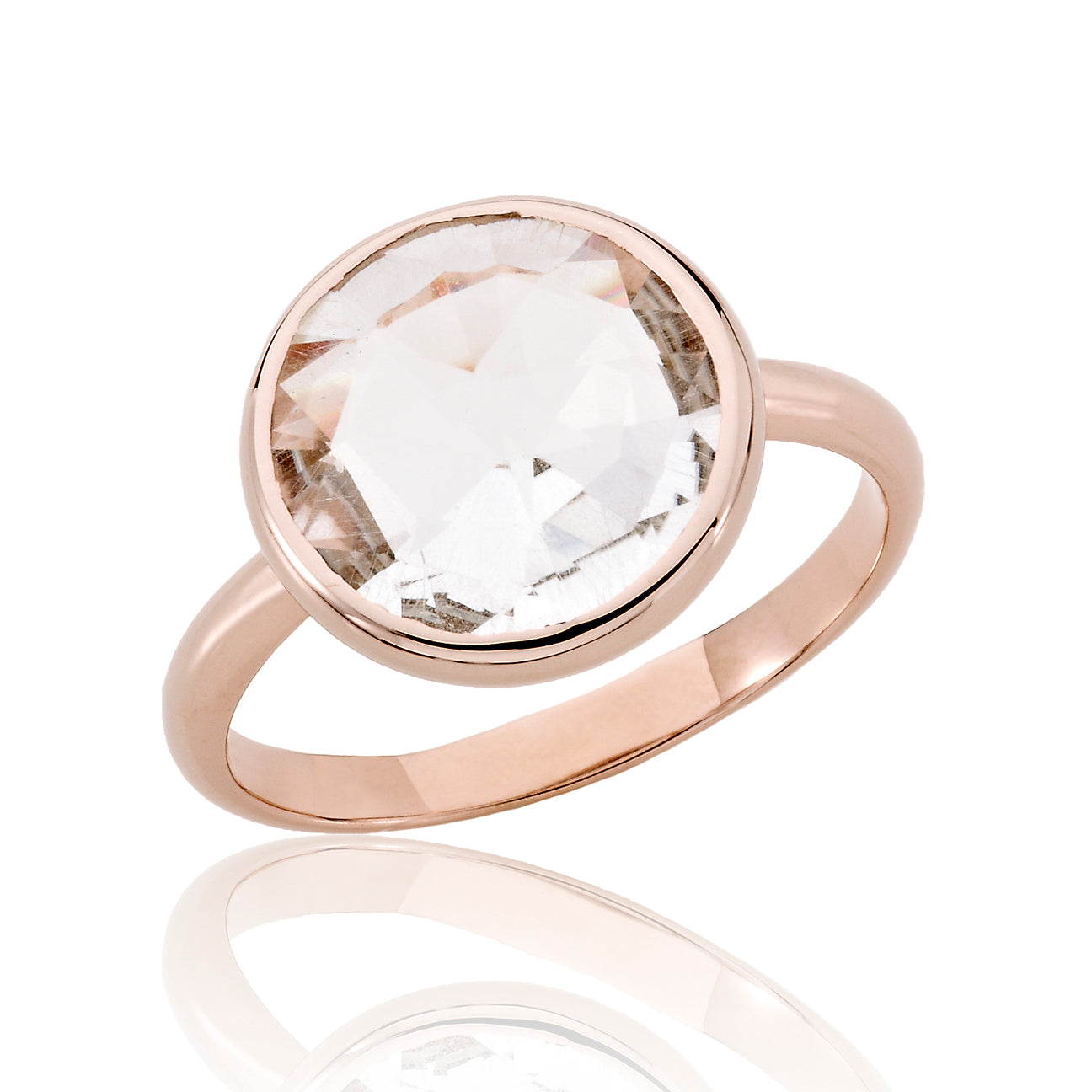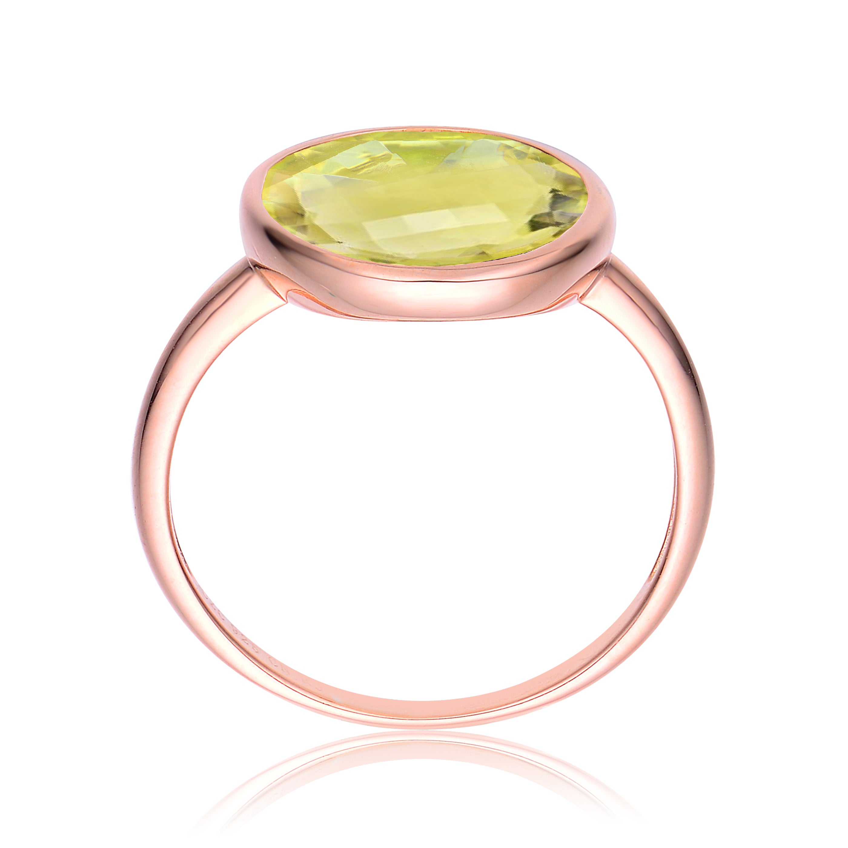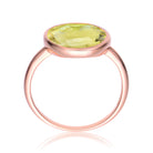 This elegant cocktail ring is crafted from .925 sterling silver with a radiant 18K rose gold–plated finish. A large, light green round cubic zirconia takes center stage in a sleek bezel setting, offering a clean, modern look with brilliant sparkle.