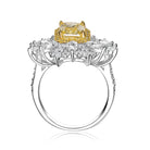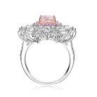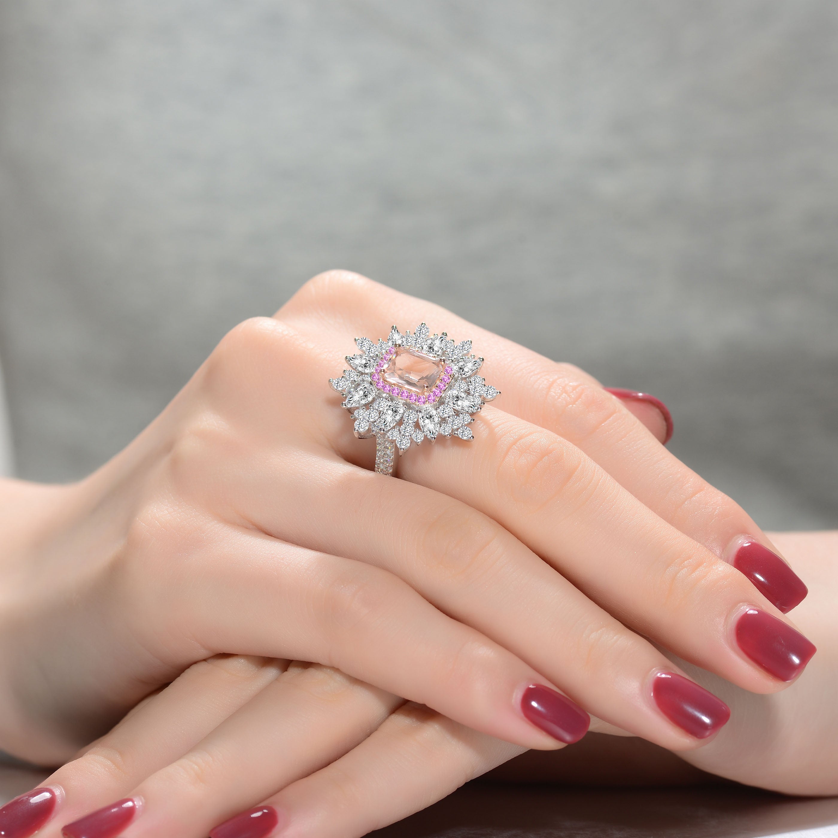 Graceful and radiant, this cocktail ring showcases a stunning morganite-toned cubic zirconia at its center, cut in a refined radiant shape. The centerpiece is enhanced by a glamorous double halo of soft pink round cubic zirconia, complemented by clear pear and round accent stones for added brilliance. Additional clear cubic zirconia stones are delicately pavé-set along the band, creating sparkle from every angle. Crafted from .925 sterling silver with a sophisticated blend of rose gold and rhodium plating, this ring is designed to impress.