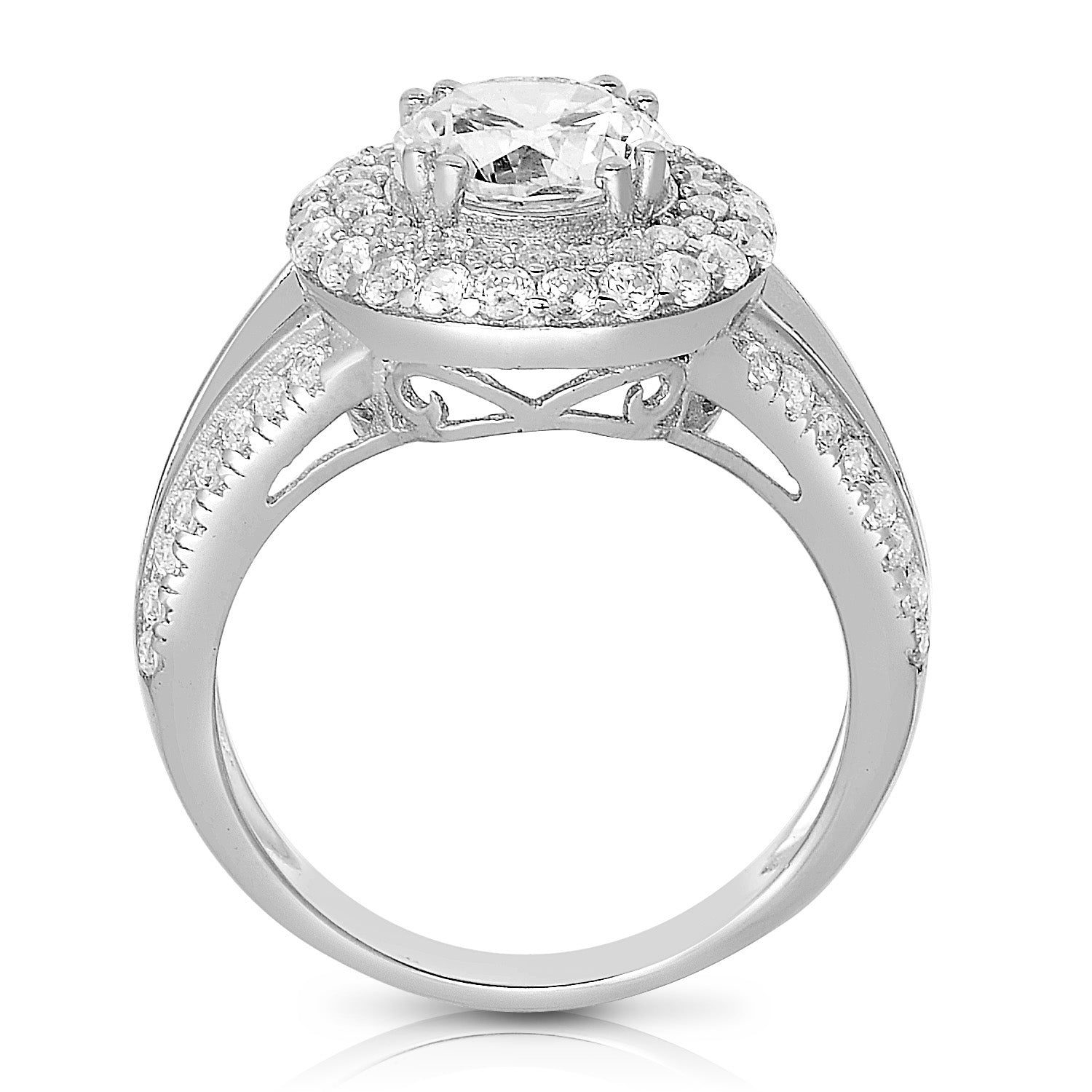 This eye-catching ring is crafted from polished sterling silver and designed to shine from every angle. A bold, dazzling center stone takes focus, framed by a halo of smaller sparkling accents that enhance its brilliance. The high-polish finish and refined setting make this ring a striking statement piece that effortlessly elevates any look.