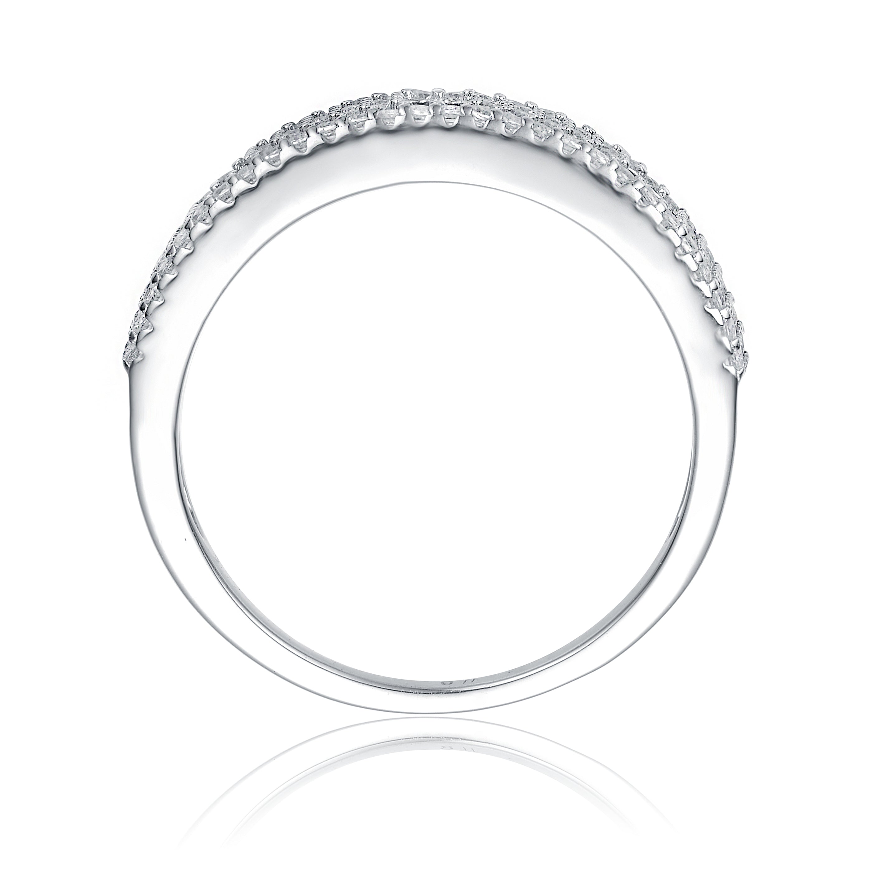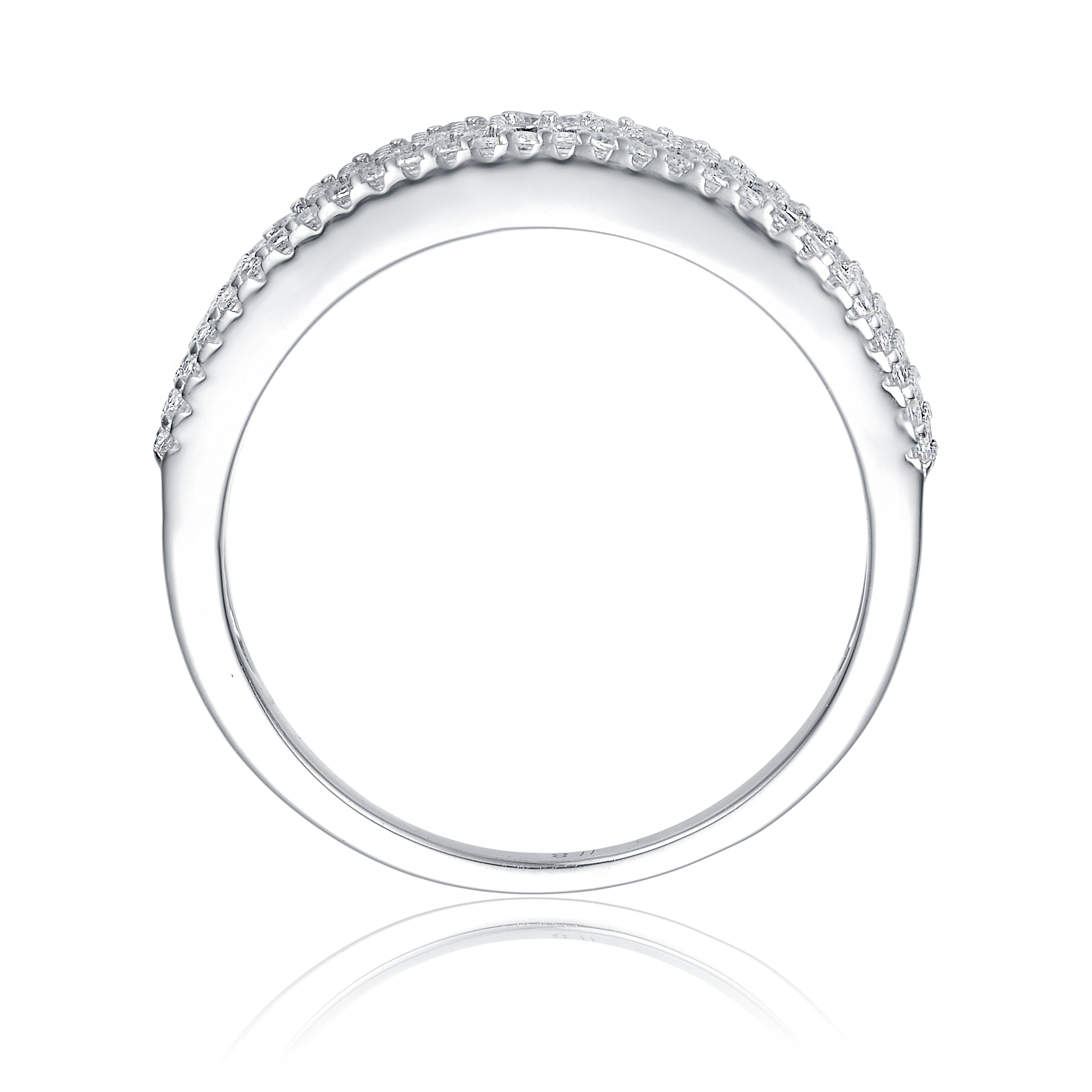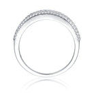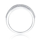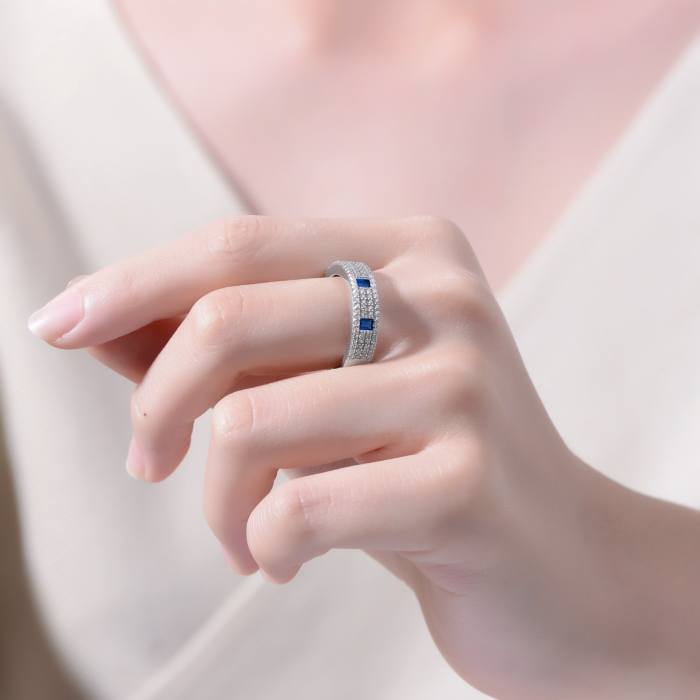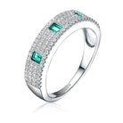 This refined band ring is crafted from sterling silver with a sleek rhodium-plated finish, offering a modern and polished look. The design features four elegant rows of shimmering clear round cubic zirconia, highlighted by three radiant-cut colored cubic zirconia stones that add a striking pop of color. Balanced and sophisticated, this ring is perfect for stacking or wearing on its own as a statement piece.