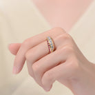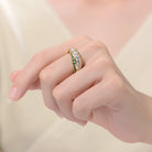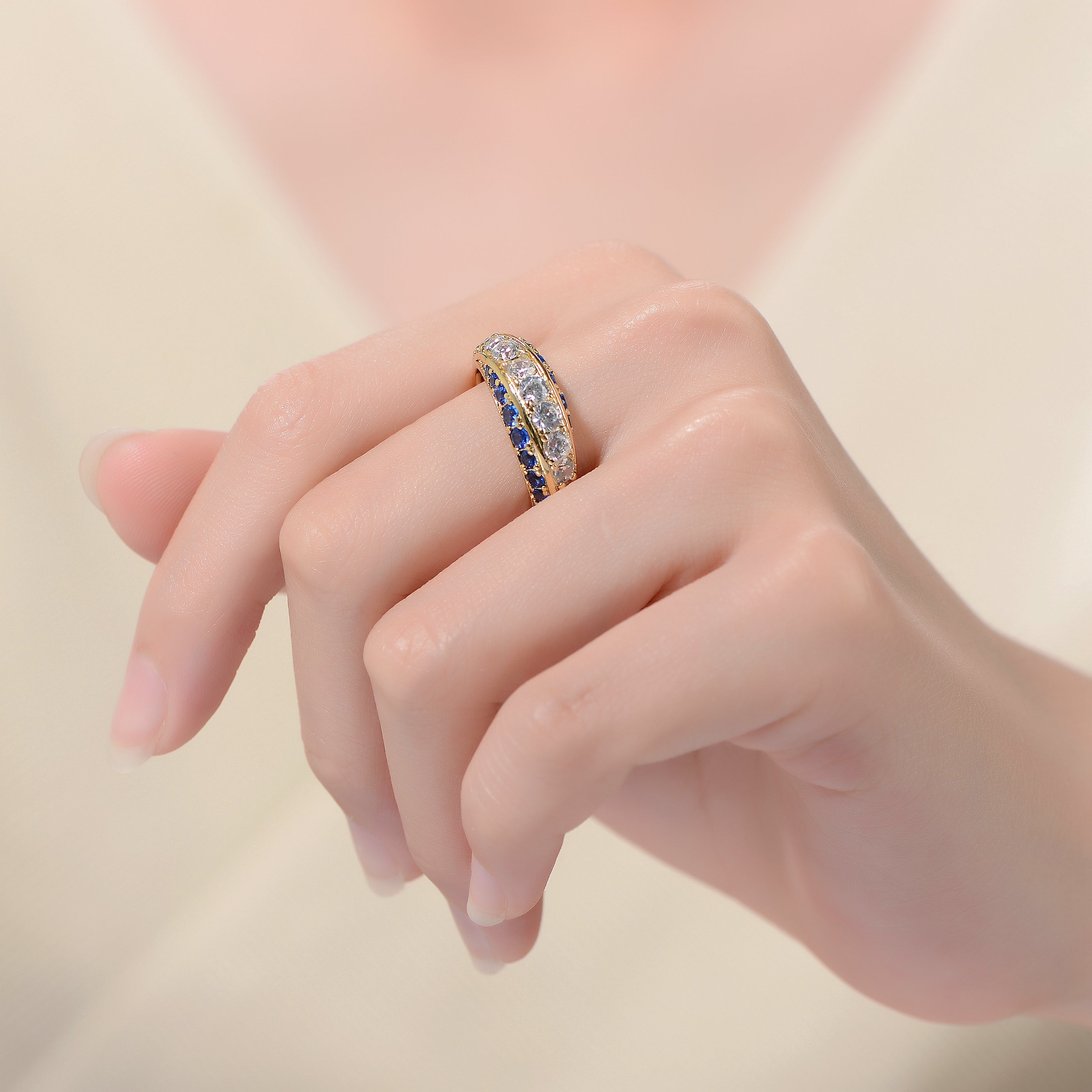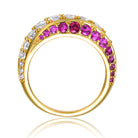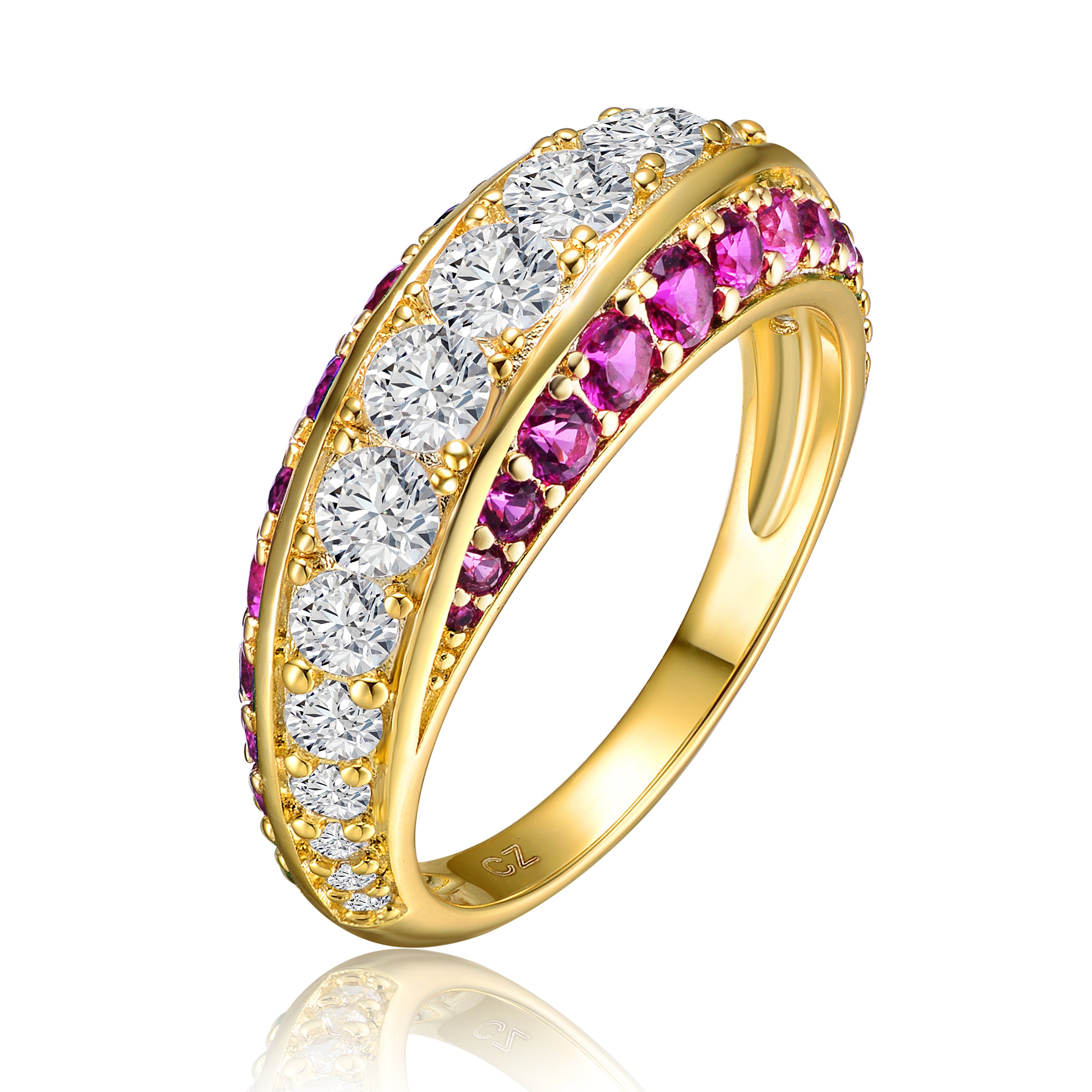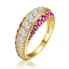 This sophisticated cocktail ring is crafted from sterling silver and finished with a radiant 14K gold plating. The design features three elegant flowing rows, with the center row highlighted by brilliant clear round cubic zirconia, while the outer rows are accented with vibrant colored cubic zirconia for a striking contrast. Polished and eye-catching, this ring delivers bold style with refined sparkle.