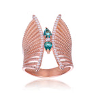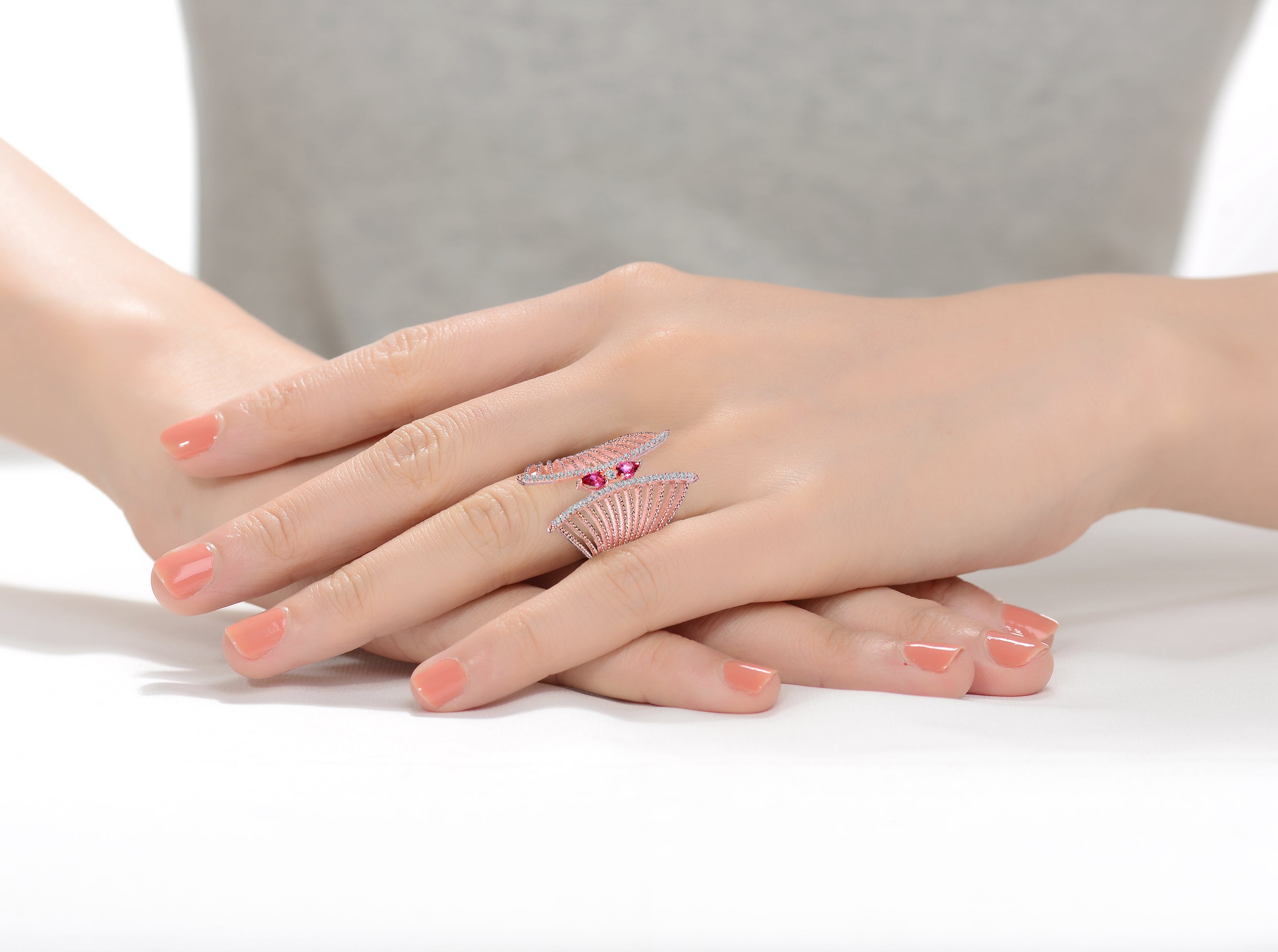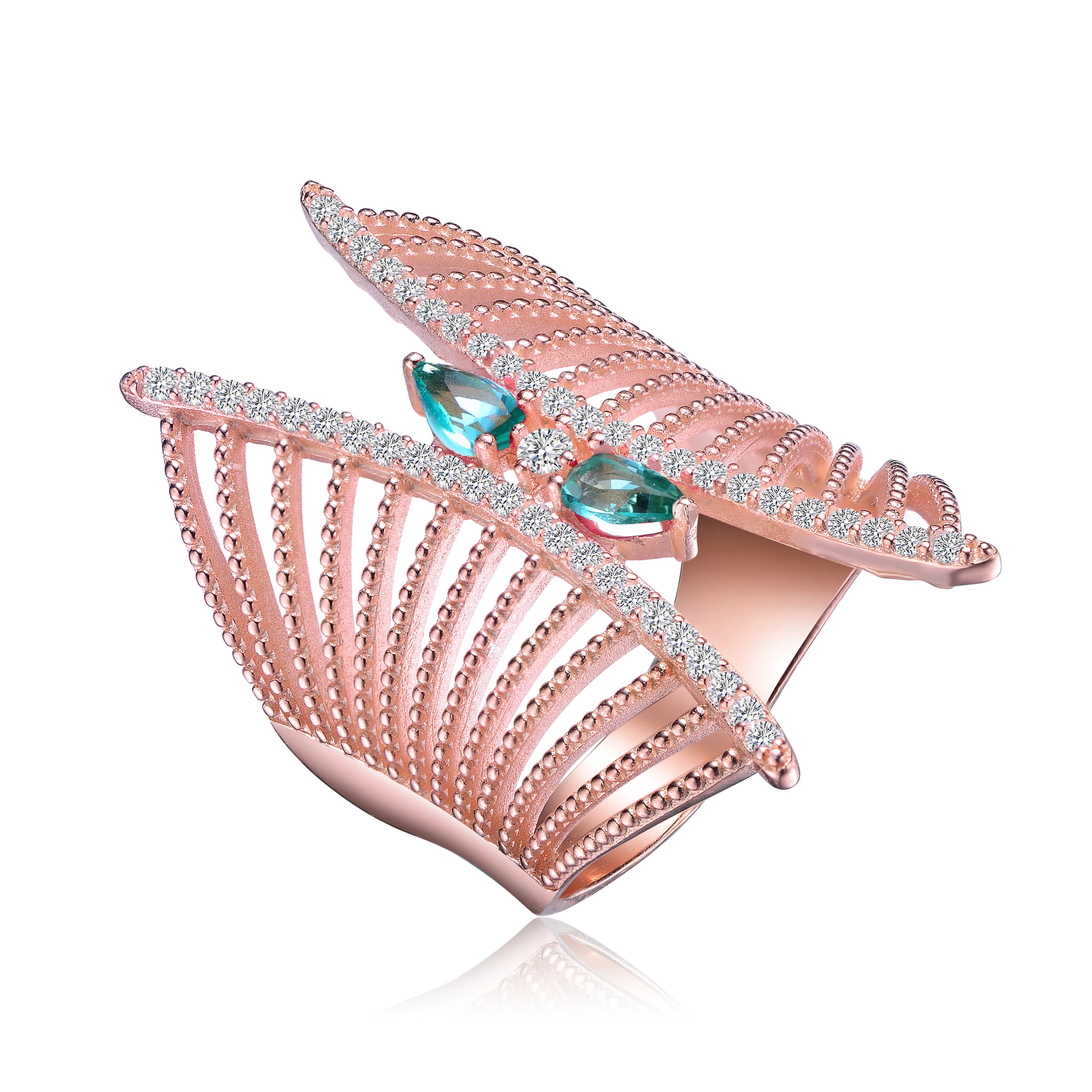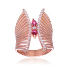 Distinctive and eye-catching, this butterfly-inspired ring showcases a dimensional design highlighted by a vibrant oval-shaped red cubic zirconia at the center. The surrounding frame is delicately paved with clear cubic zirconia stones, adding sparkle and depth to the silhouette. Crafted from sterling silver with an elegant 18K rose gold-plated finish, this ring beautifully enhances the intricate butterfly motif.