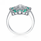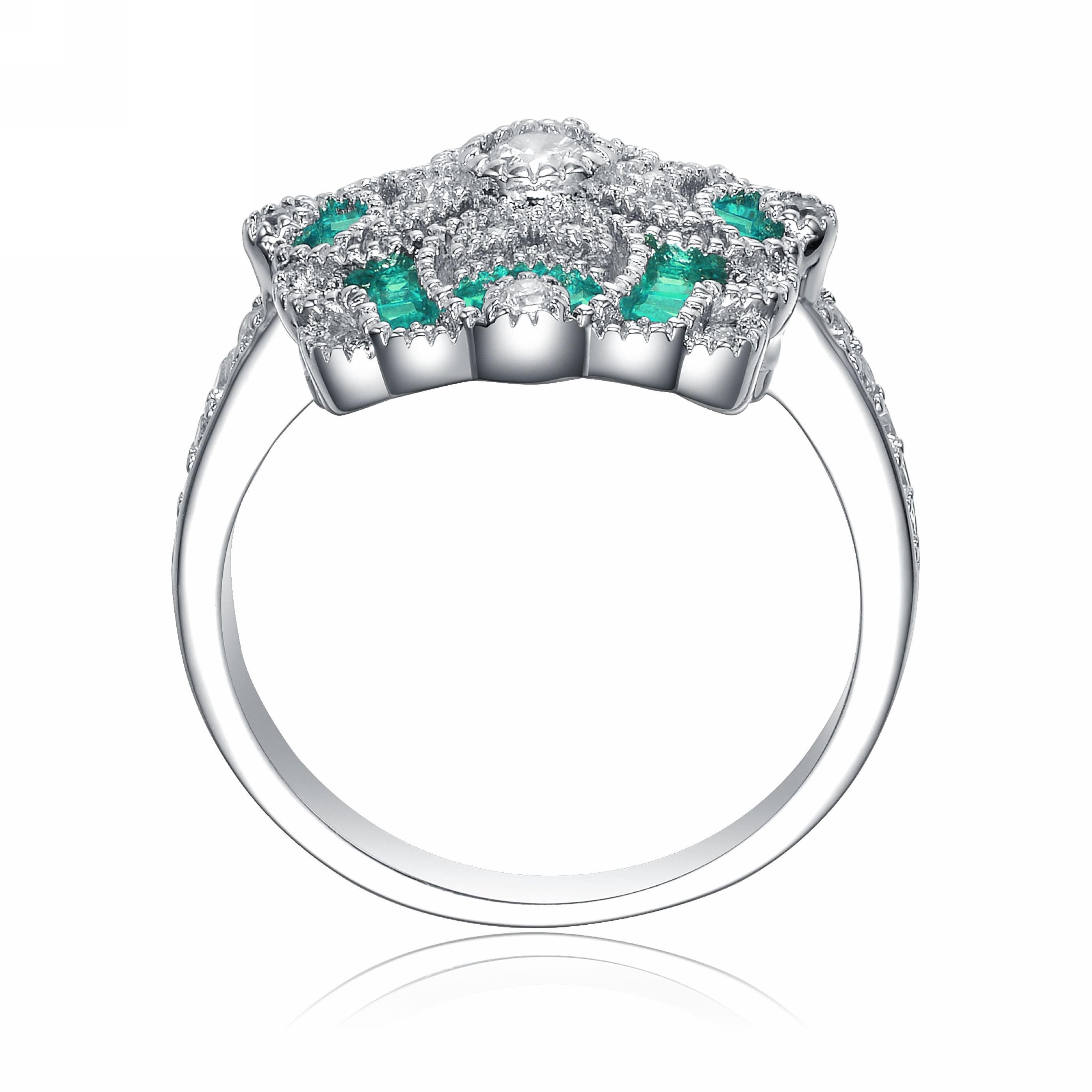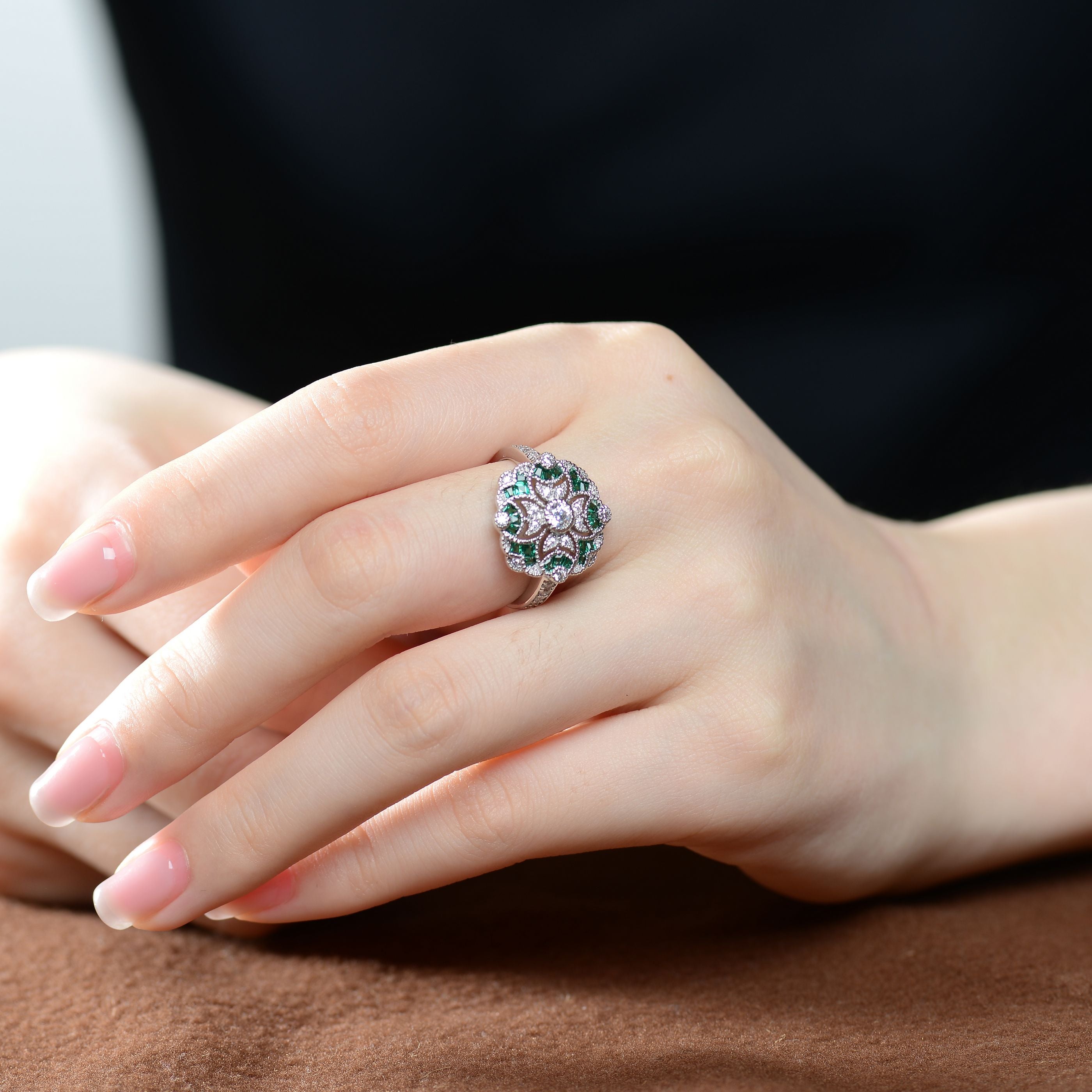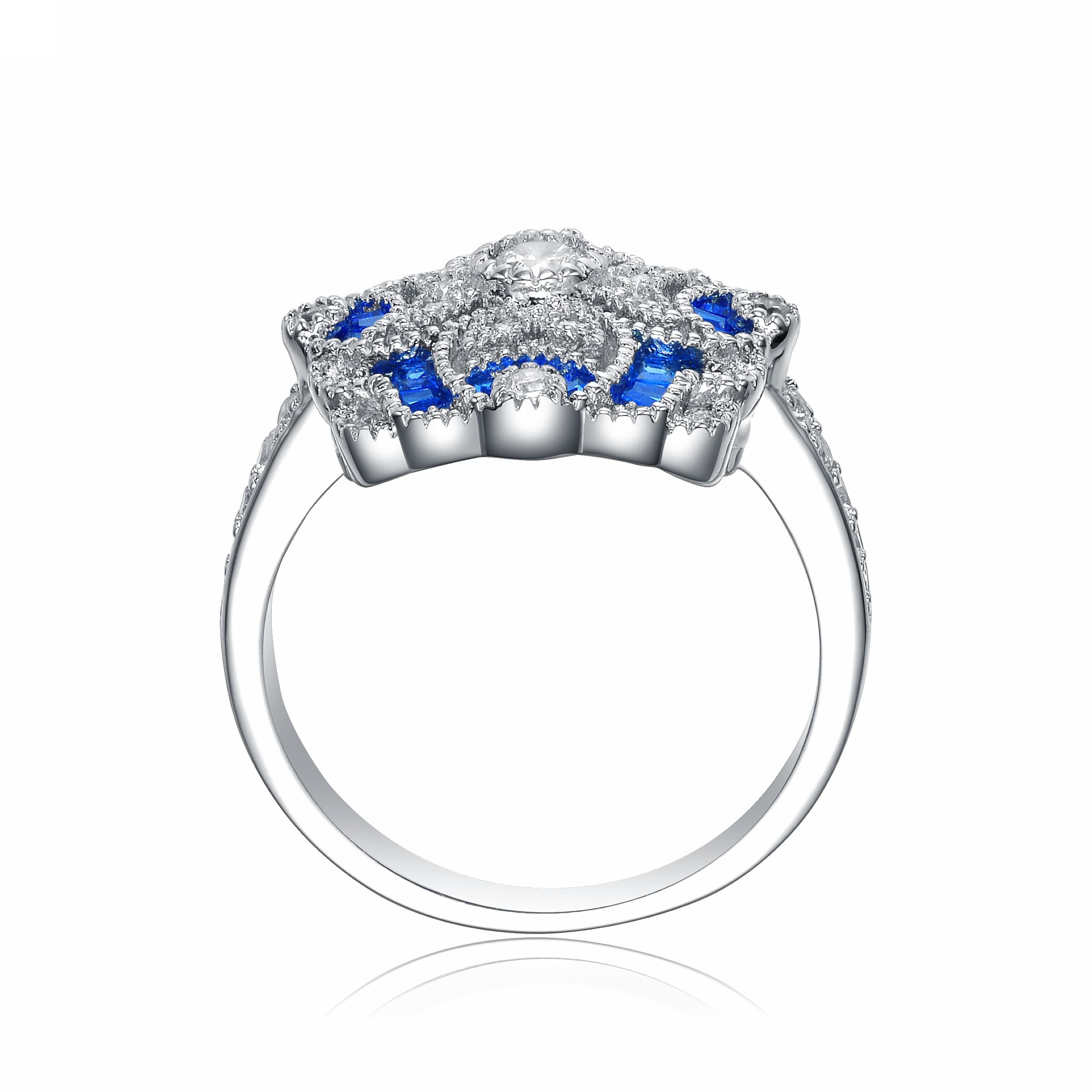 - Design: Floral motif with baguette and round stone accents