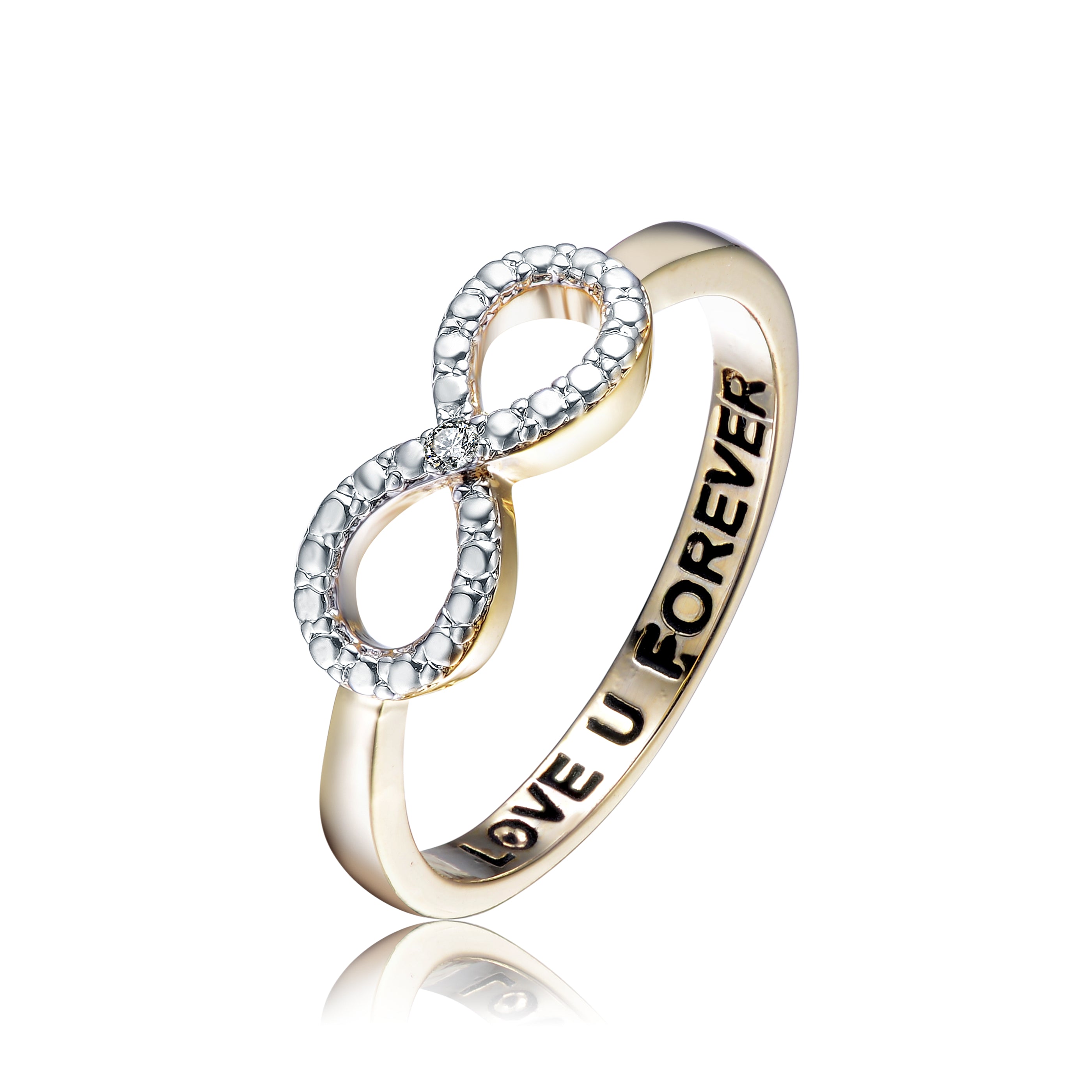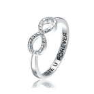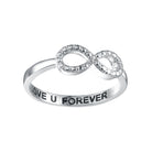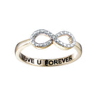 This elegant ring features a graceful figure-eight design accented with sparkling white cubic zirconia, set atop a sleek, polished band. Crafted from sterling silver with a refined gold-toned finish, the minimalist silhouette makes it ideal for everyday wear. A subtle engraved message along the band adds a meaningful touch, making this piece both stylish and sentimental.