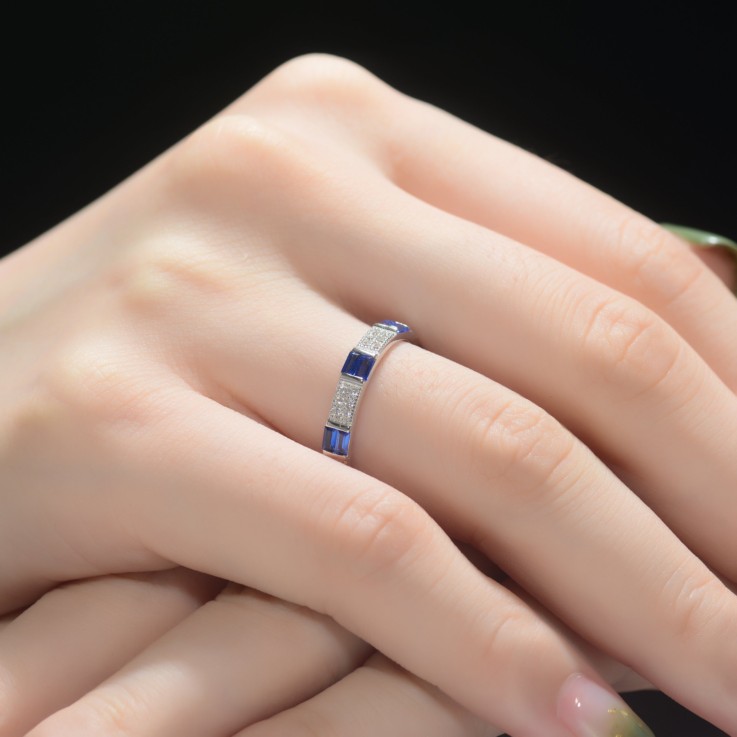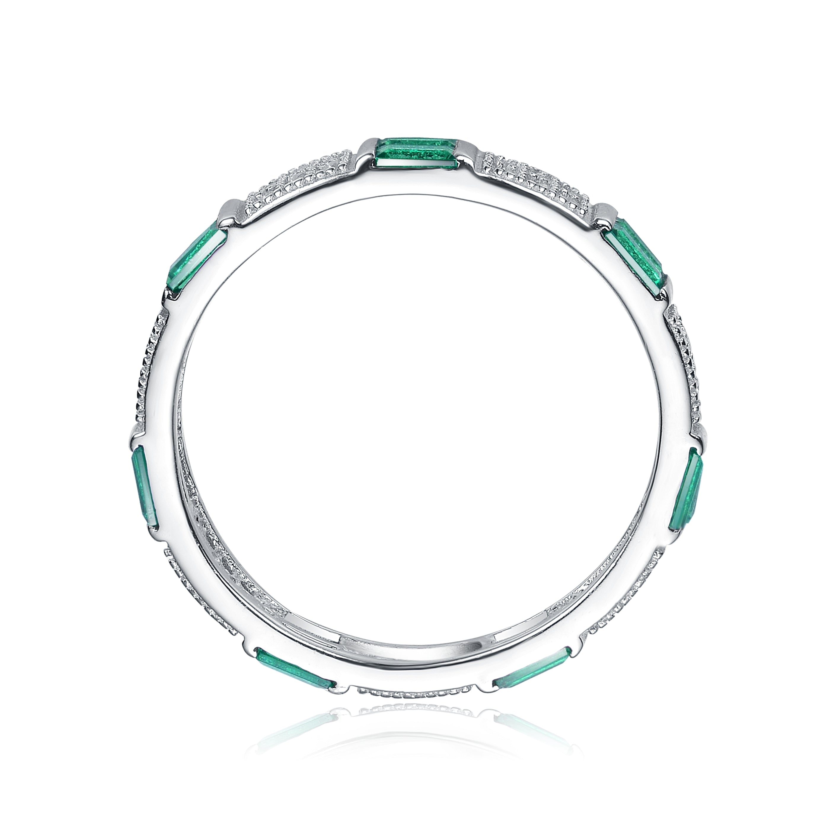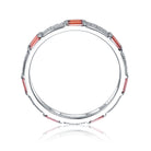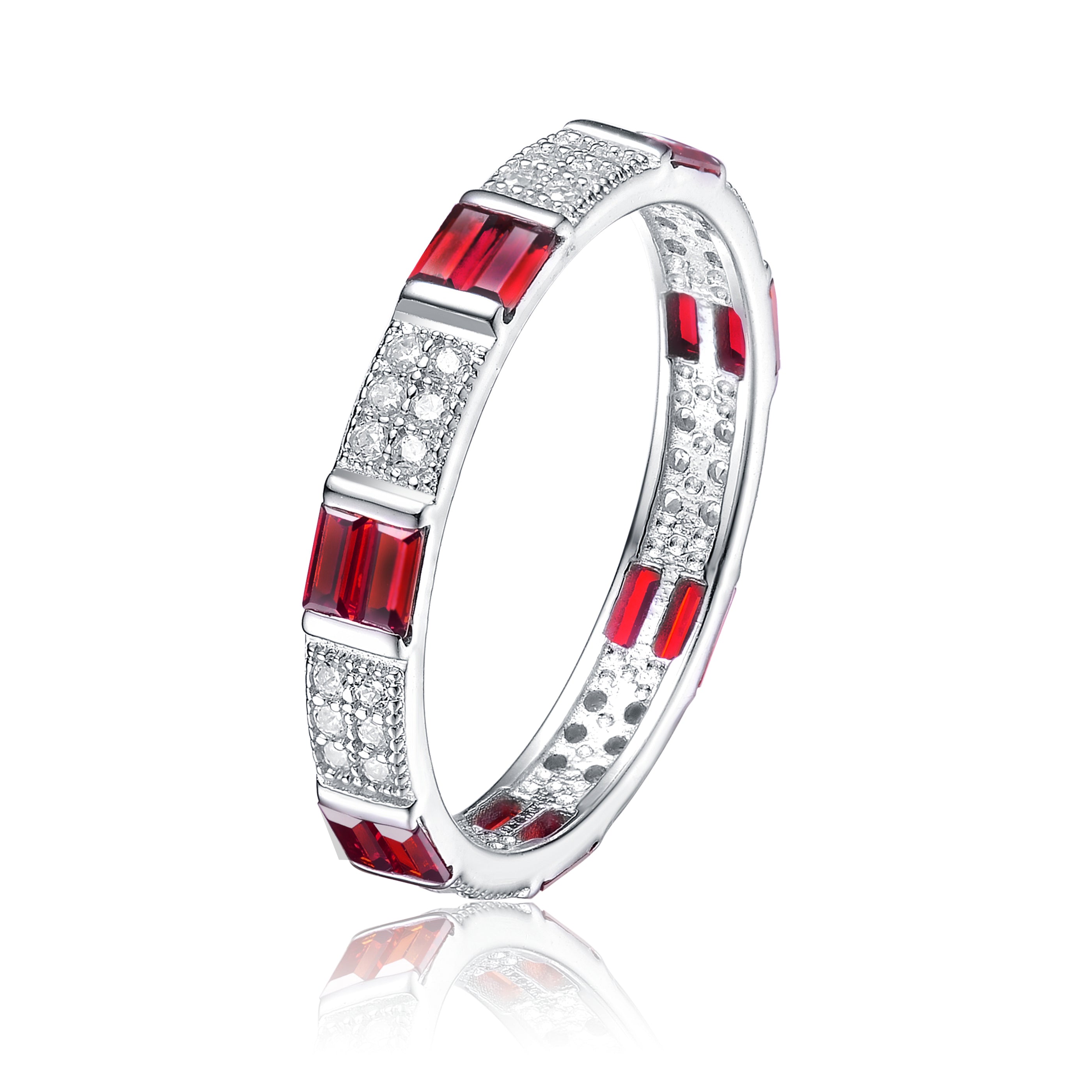 This refined eternity-style stacking ring is crafted from sterling silver with a sleek white gold–plated finish, offering endless styling versatility. Alternating baguette-cut cubic zirconia with brilliant round-cut accents create a striking rhythm of color and sparkle around the band. Designed to layer effortlessly or stand alone, this piece delivers a polished look for everyday wear or special occasions.