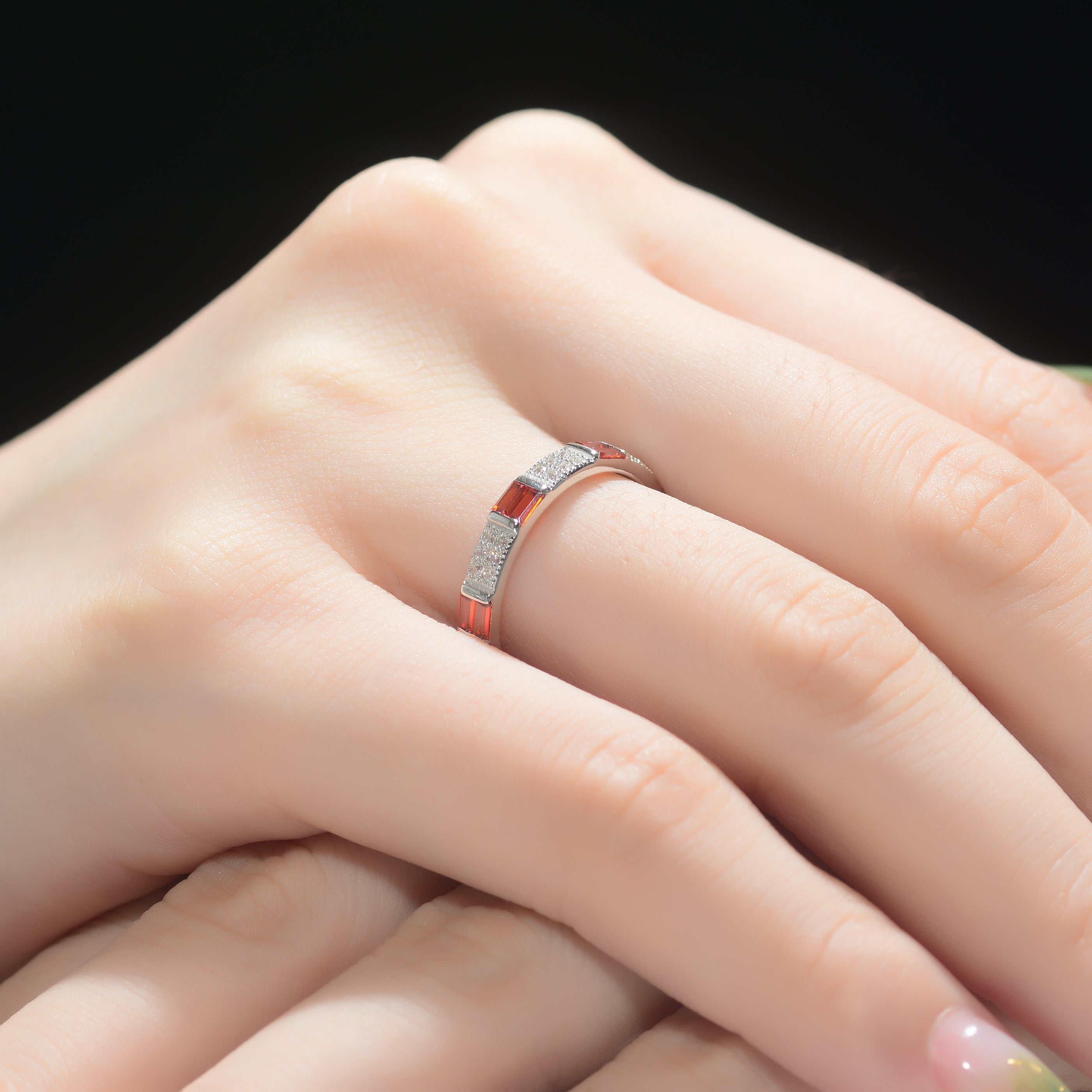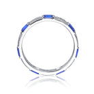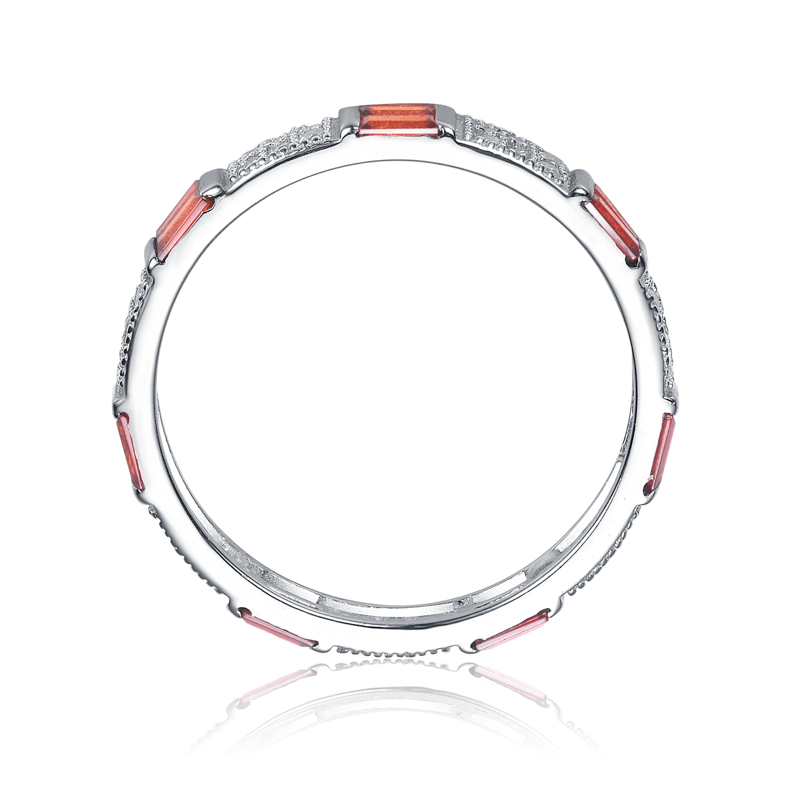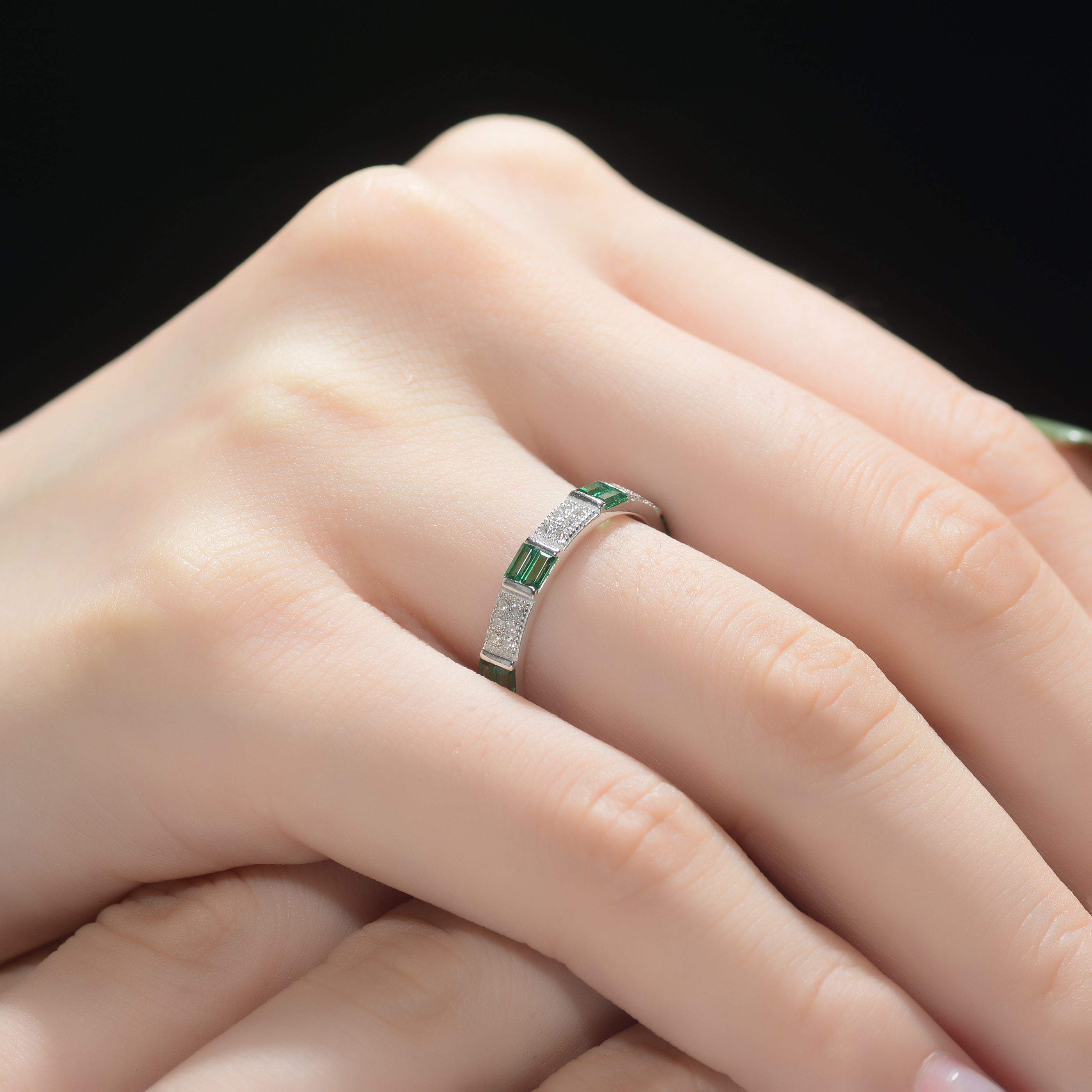 This refined eternity-style stacking ring is crafted from sterling silver with a sleek white gold–plated finish, offering endless styling versatility. Alternating baguette-cut cubic zirconia with brilliant round-cut accents create a striking rhythm of color and sparkle around the band. Designed to layer effortlessly or stand alone, this piece delivers a polished look for everyday wear or special occasions.