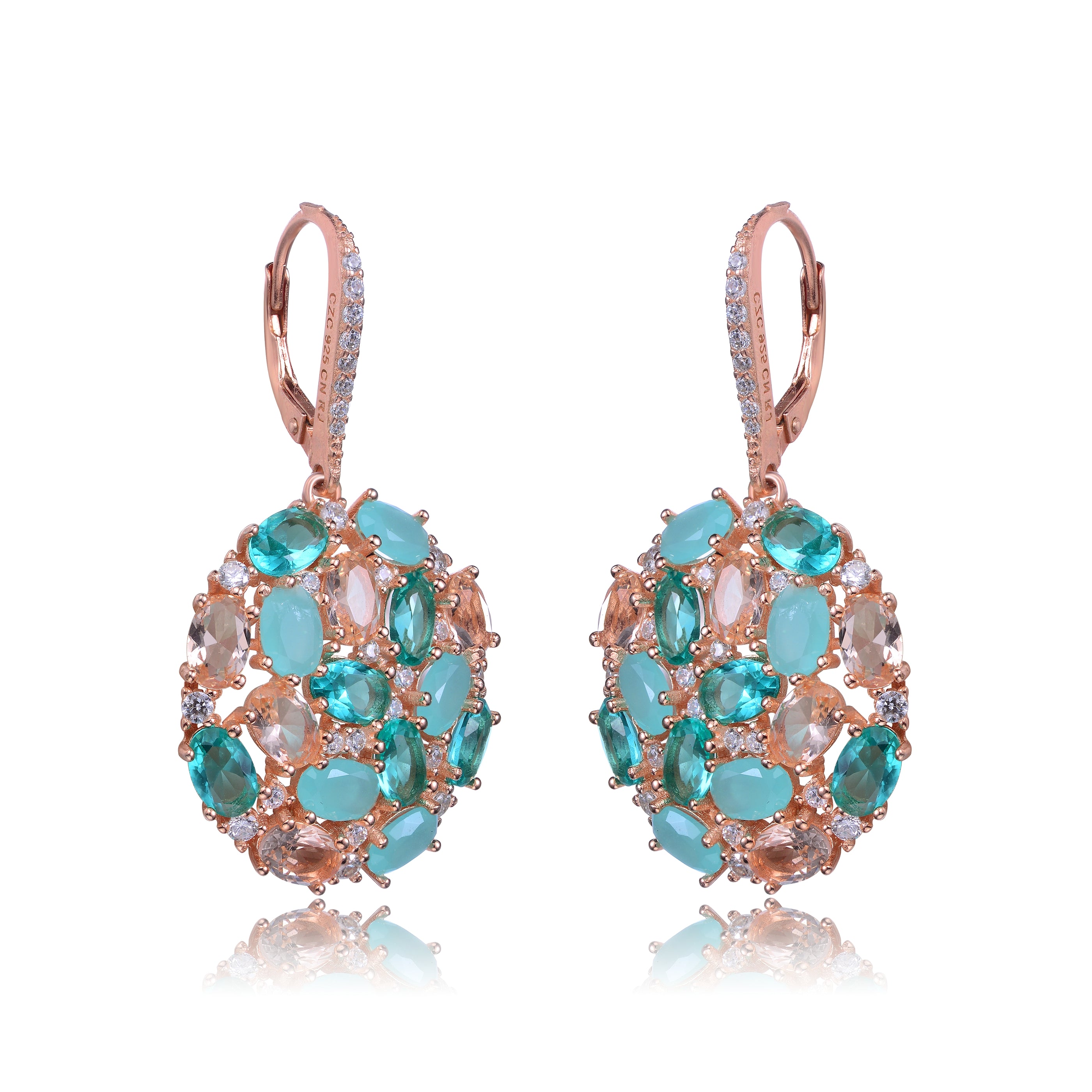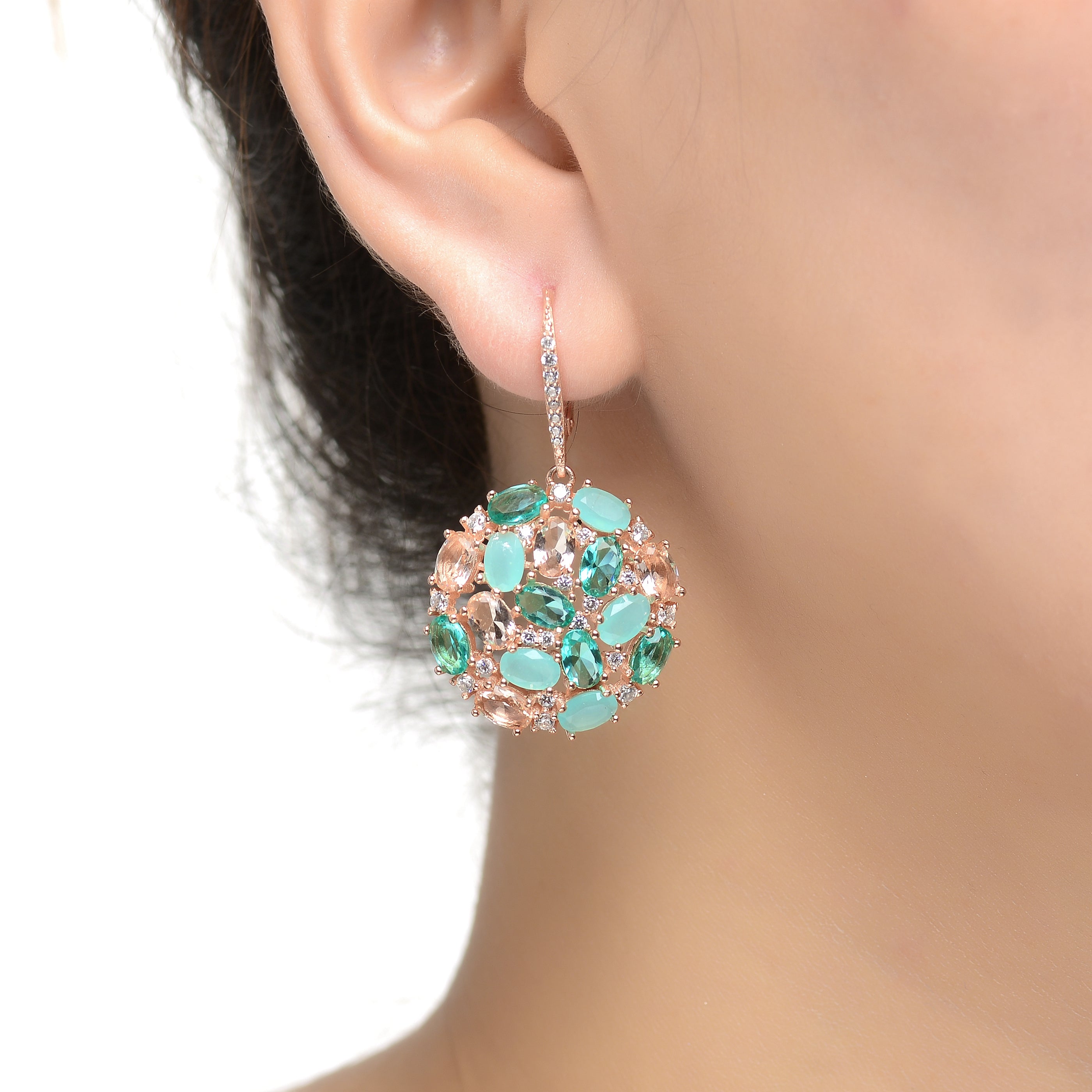 Round shaped design with combination of morganite and aqua cubic zirconia pronged in the middle with accent of small clear gemstones. These drop earrings are made from .925 sterling silver plated with 18K Rose Gold Plated and secured with butterfly clasp.