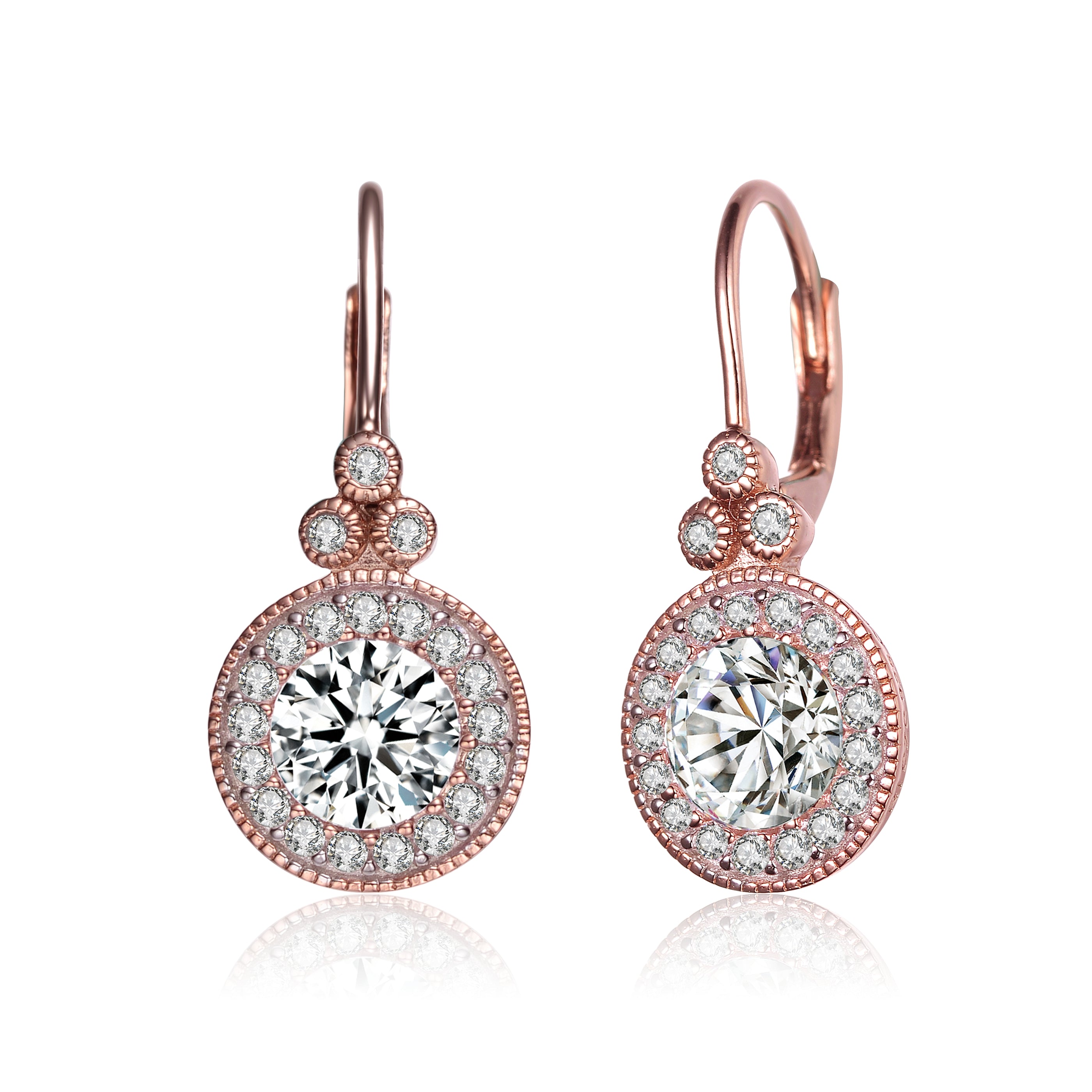 Gorgeous drops filled with round brilliant cut cubic zirconia s sit nestled inside concentric halo clusters in a romantic, vintage inspiration, along with mini bezel accents. These dazzling designs dangle on wire huggie hoops with lever backs, all in 18K Rose and14K Gold Plated sterling silver.