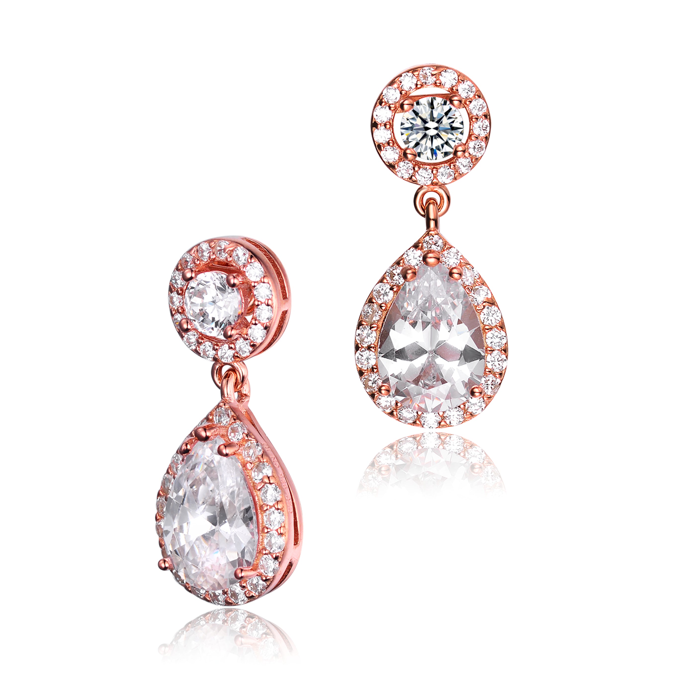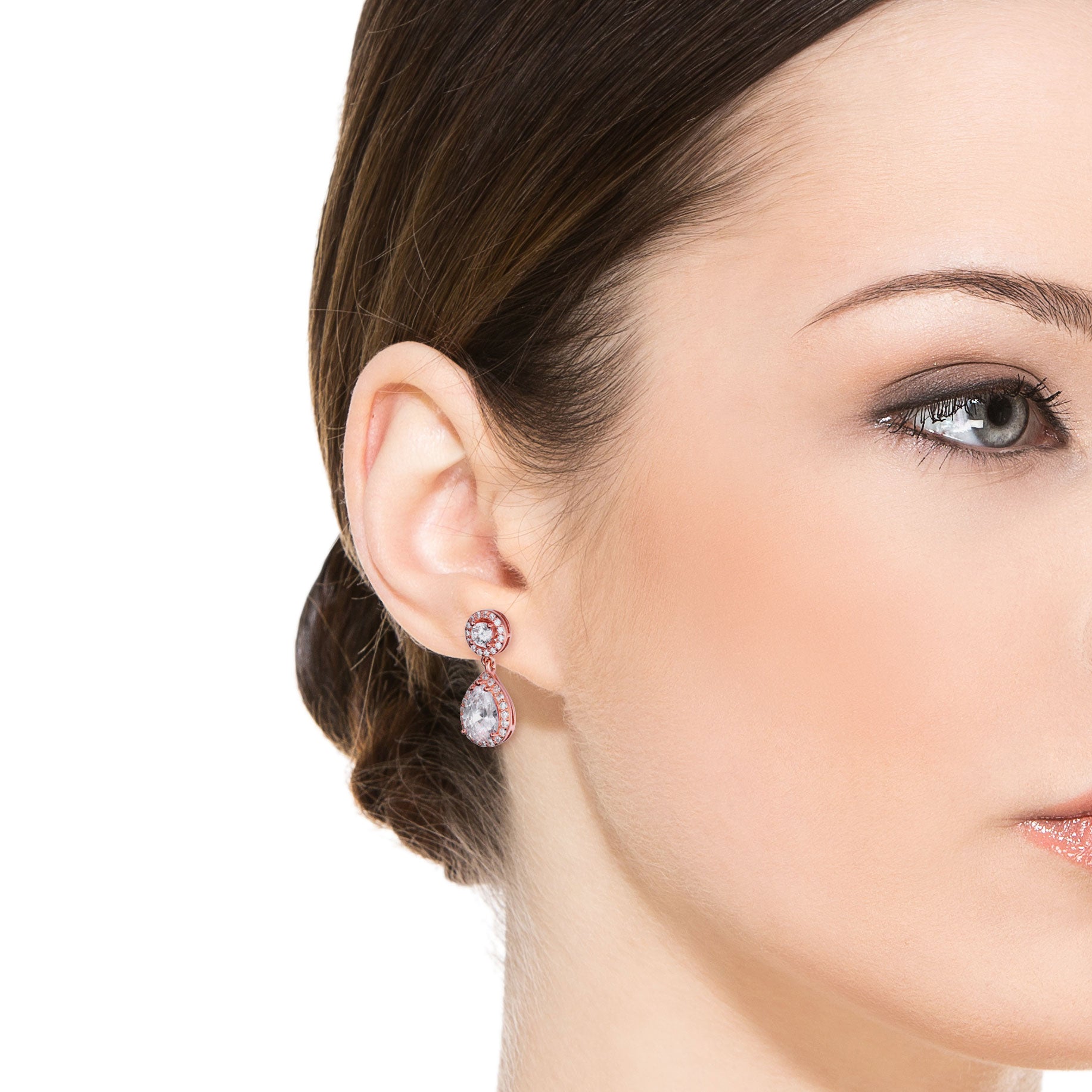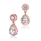 Steal the spotlight when wearing these rose gold platted sterling silver drop earrings. A large clear cubic zirconia solitaire sits at the core and a round cut cubic zirconia on its top both sorrounded by a line of small cubic zirconias.