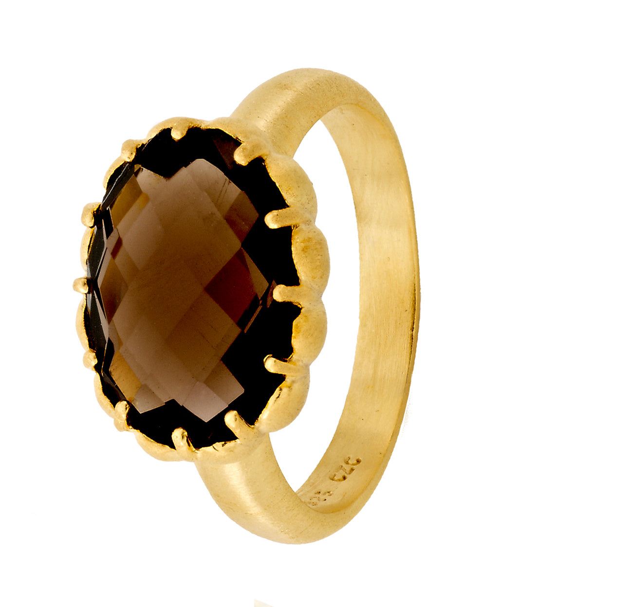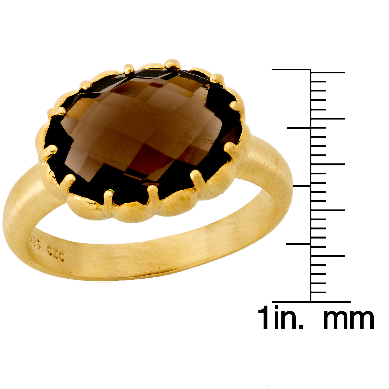 This striking cocktail ring features a large smokey oval-cut cubic zirconia as its focal point. The deep, rich tone of the stone creates a dramatic contrast against the warm gold-plated band. Designed to stand out, the bold silhouette adds instant sophistication to any look. Its smooth finish ensures comfortable wear while maintaining a polished appearance. Perfect for evening styling or special occasions, this ring delivers confident elegance. It is a standout piece designed to make an impression.