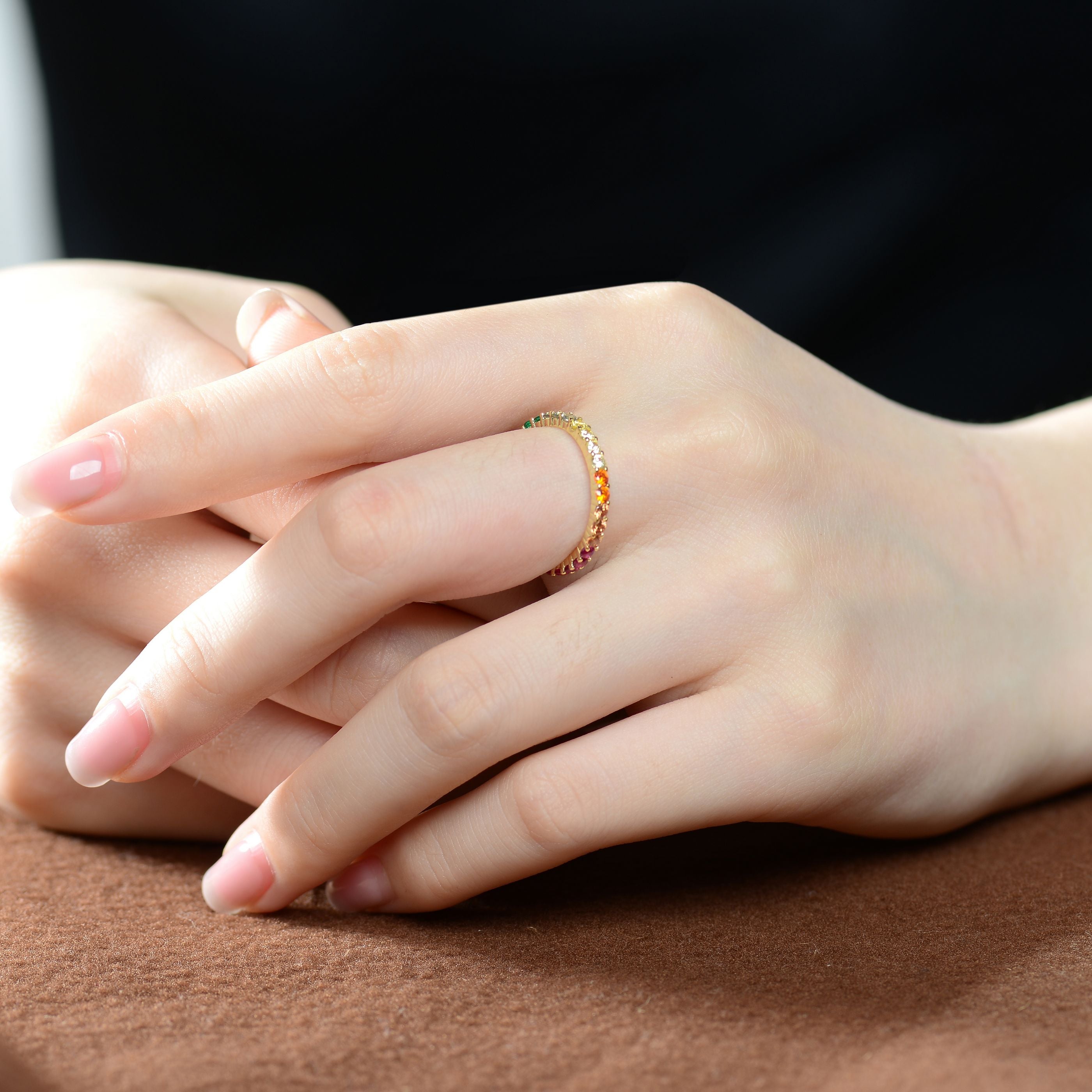 This vibrant eternity ring features a continuous row of rainbow-colored cubic zirconia stones. Crafted in sterling silver with gold plating, it brings playful color to a refined silhouette. The slim band makes it ideal for stacking or wearing solo. Each stone adds a pop of brilliance while maintaining balance. Designed for everyday wear, it feels lightweight and comfortable. A joyful ring that adds personality and color to any jewelry collection.