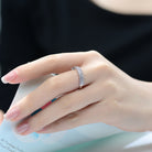 This elegant band ring features a sleek zig-zag pattern formed by three shimmering rows. Clear cubic zirconia stones are prong set to maximize sparkle and dimension. The structured design creates a modern yet timeless silhouette. Crafted in rhodium plated sterling silver, it offers a bright and polished finish. The band feels comfortable and balanced on the finger. A versatile ring perfect for stacking or wearing on its own.