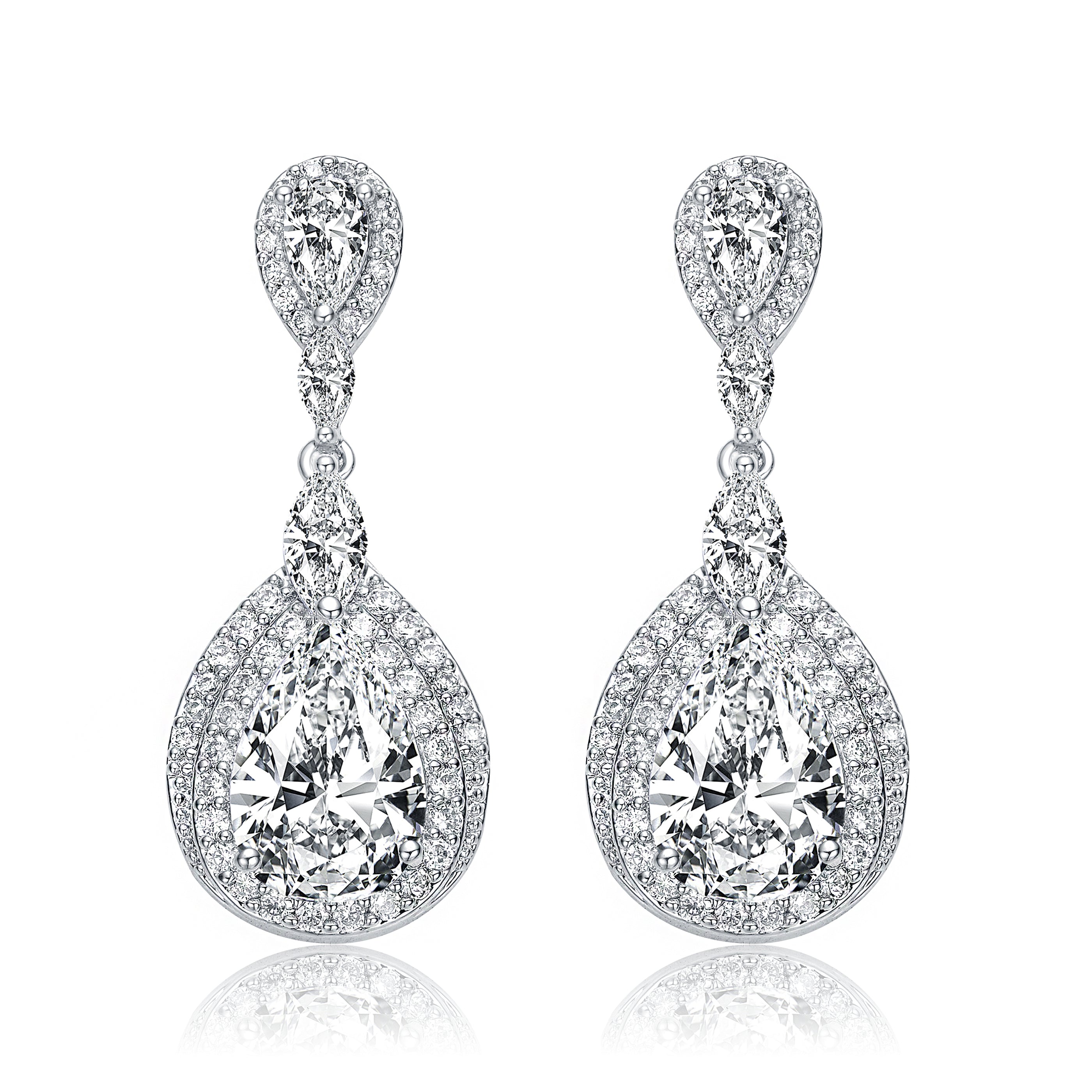 Elegant .925 Sterling silver multi shaped cubic zirconia dangle earrings. These earrings feature clear pear cubic zirconia with clear round cubic zirconia double halo and accentuated with clear marquise cubic zirconia. Crafted in .925 Sterling silver with rhodium plated and secure with butterfly clasp. Add an additional style to your look every time you wear these earrings.