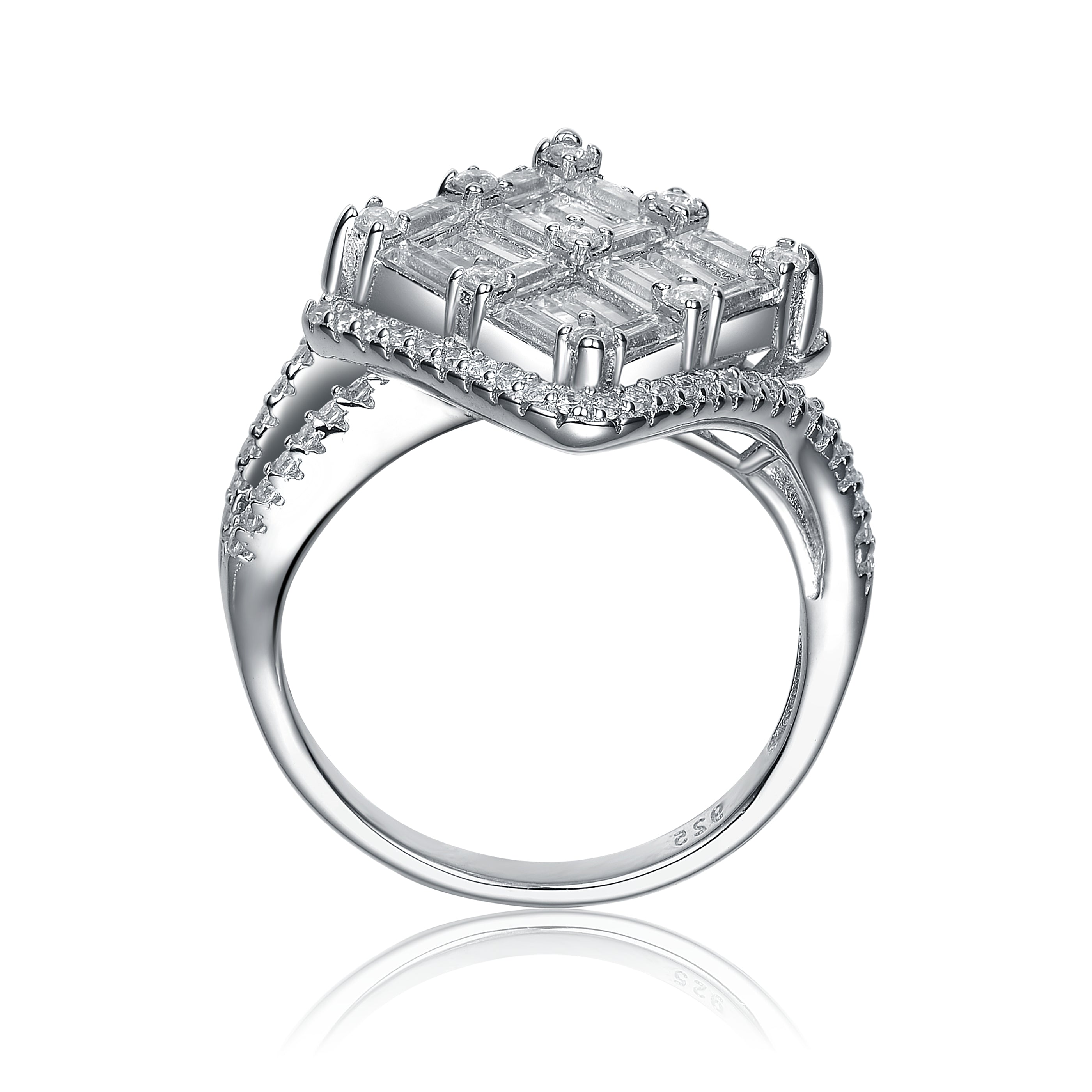 Stylish .925 Sterling silver cubic zirconia cluster engagement ring. This ring features center made out of larger clear baguette cubic zirconia stones, accented by clear round cubic zirconia between, as well as paved on the square frame and the band. Crafted of .925 Sterling silver in rhodium plating and it is available in 6, 7, 8 size.