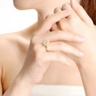 Elegant .925 Sterling silver gold plated cubic zirconia pave floral ring. This ring features a floral alike design made out of clear large radiant cubic zirconia in the center set in bezel, accented by small cubic zirconia stones set two by two to compliment its unique dimension. Crafted of .925 Sterling silver with gold plating and it is available in sizes 6, 7, 8. Makes a great gift as well.