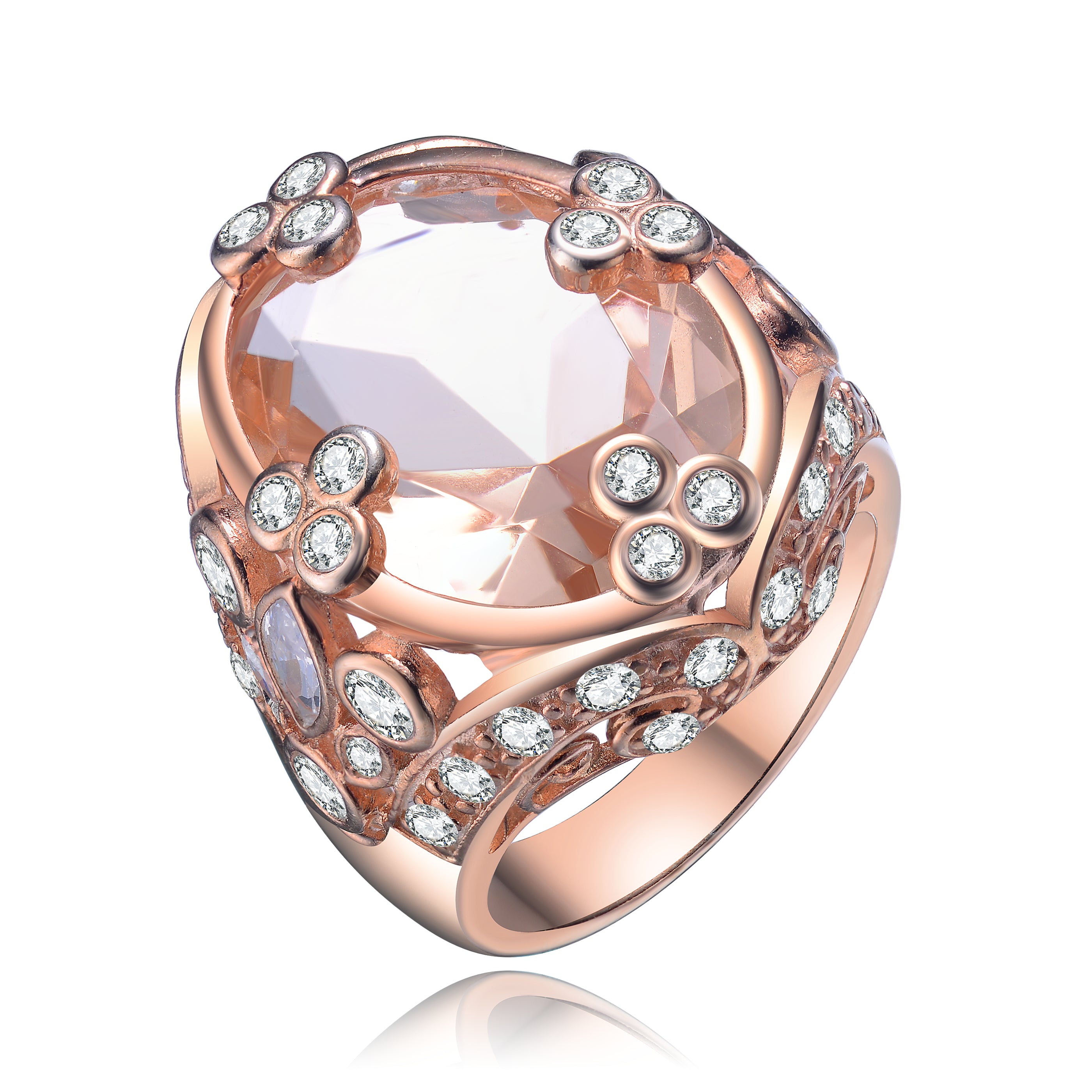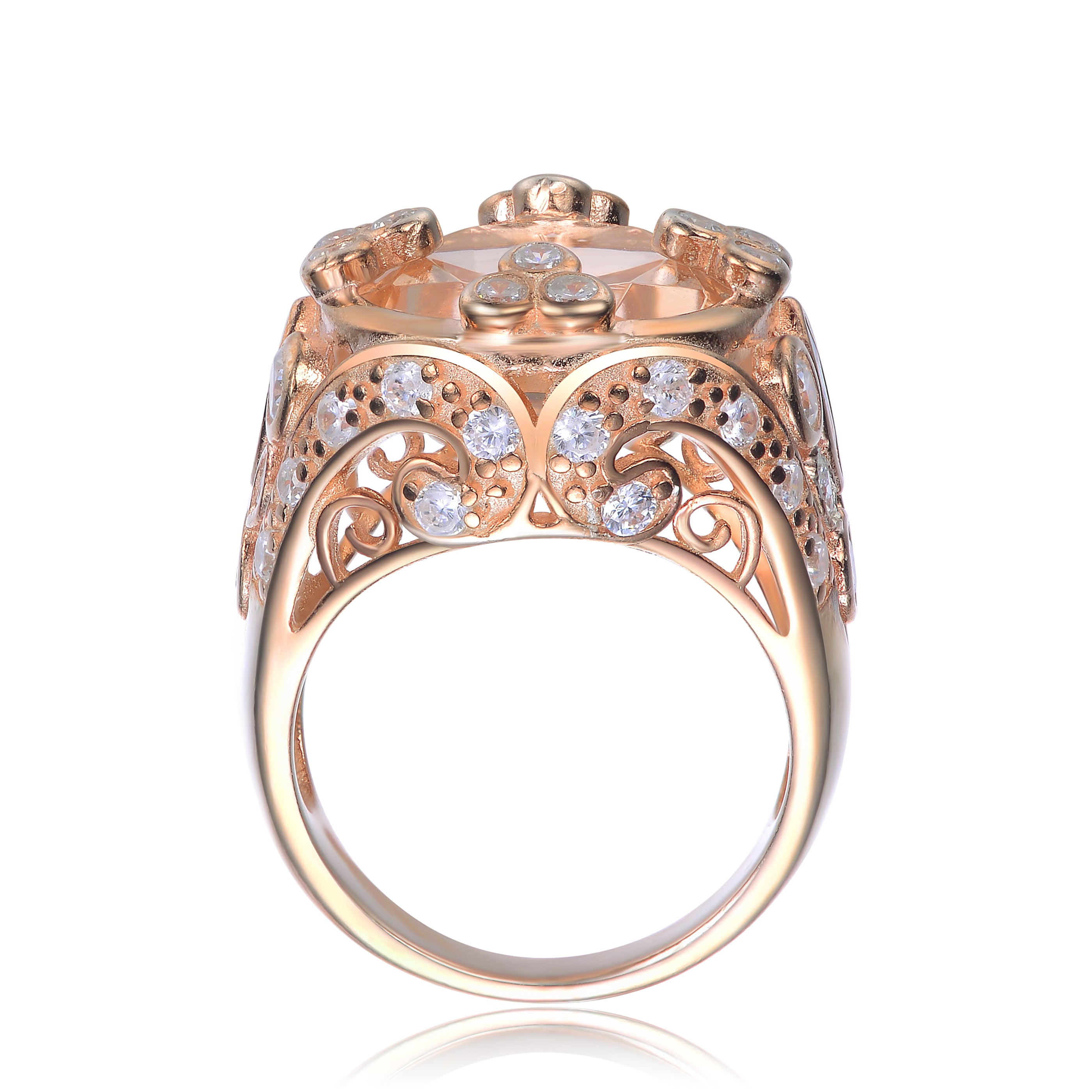 This elegant solitaire ring showcases a vibrant cubic zirconia centerpiece accented by delicate clear stones in a floral-inspired arrangement. Finished in warm rose gold plating, the design blends classic charm with modern sparkle.