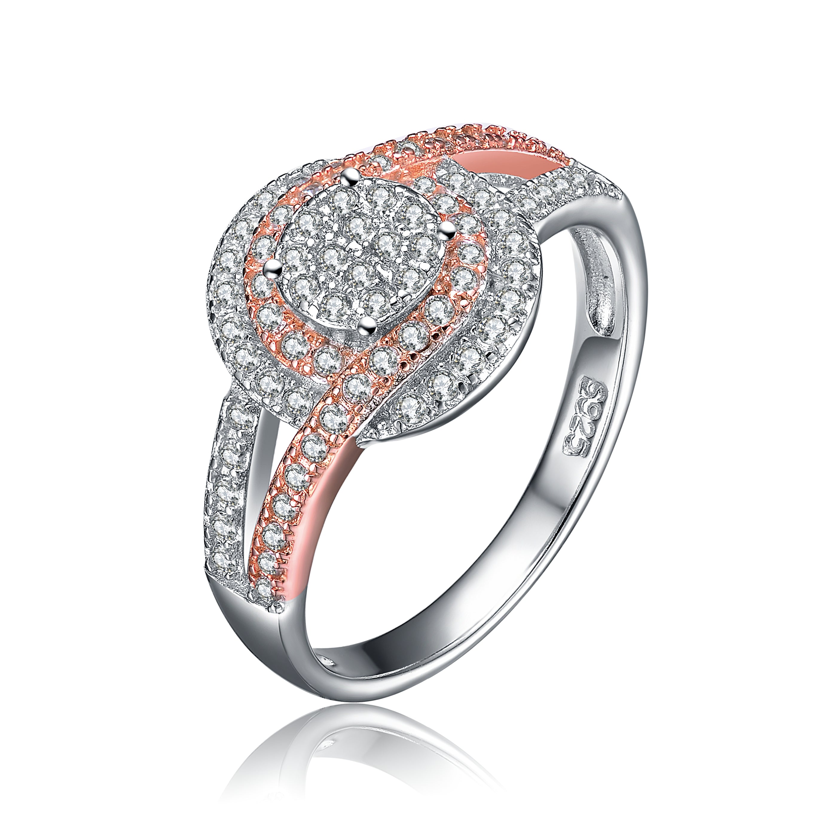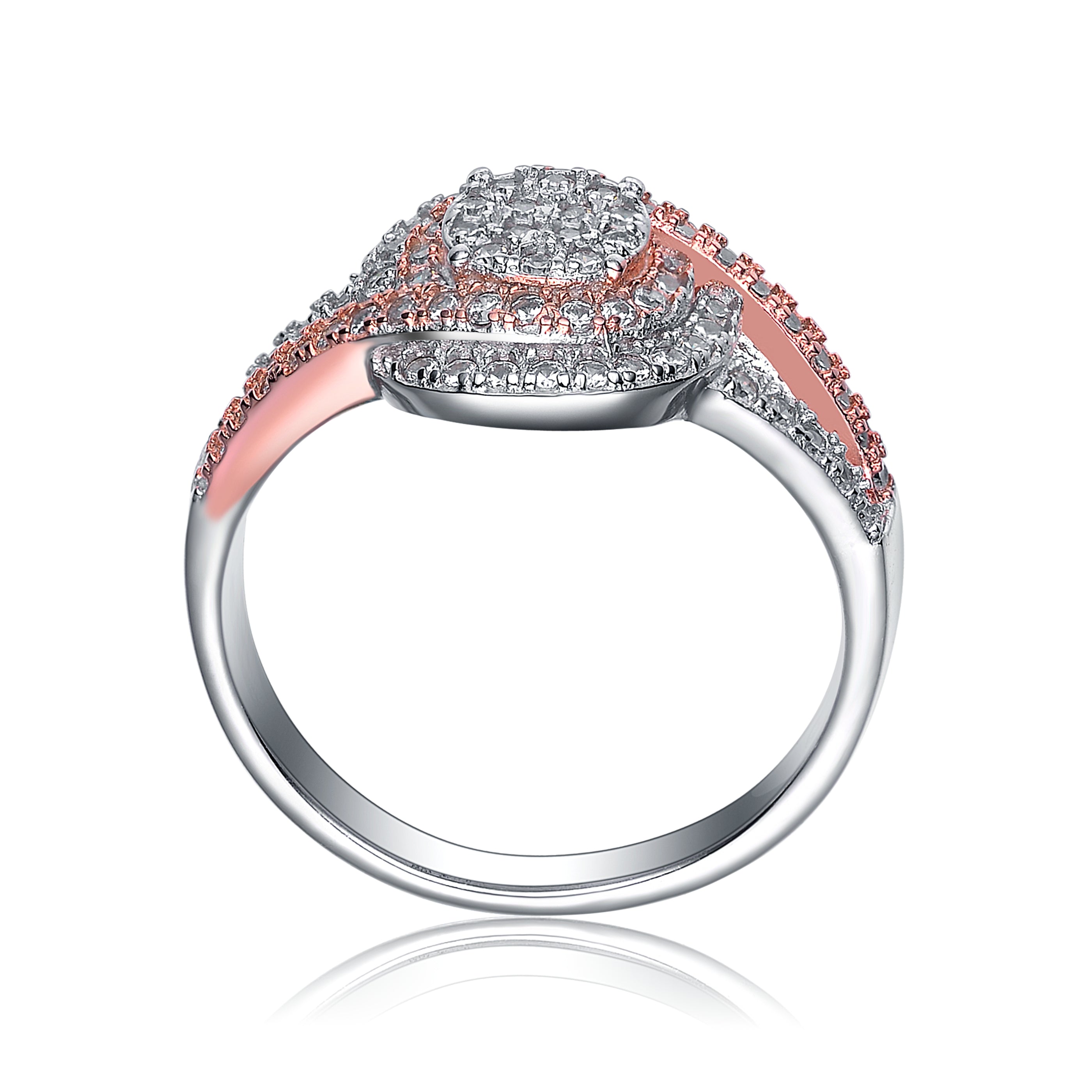 With a playful yet elegant personality, this sterling silver ring combines shimmering pave-set cubic zirconia with warm rose gold overlay accents. The layered tones create a modern look that feels both distinctive and effortlessly stylish.