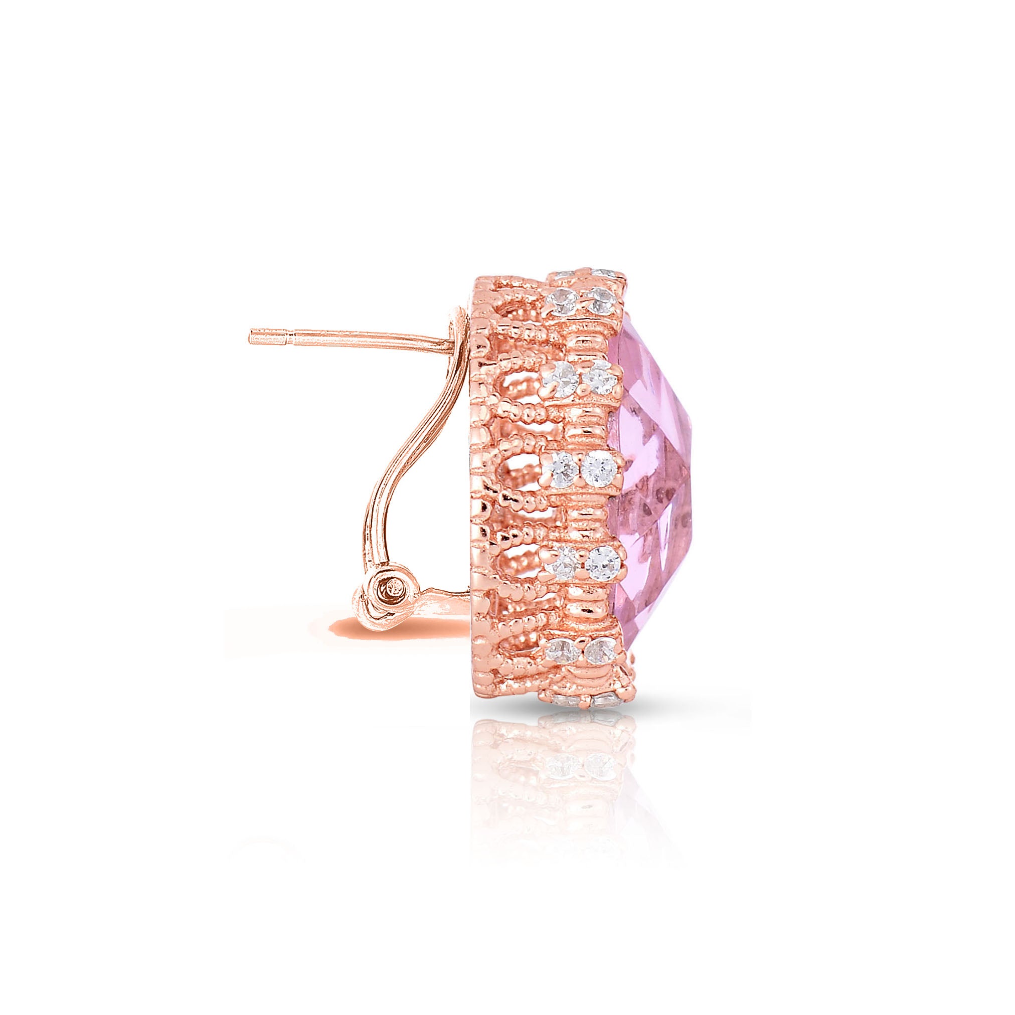 These dainty rose plated oval earrings feature pink square cubic zirconia stones, enhanced with smaller white round ones. Crafted of .925 sterling silver the earrings secure with butterfly clasps.
