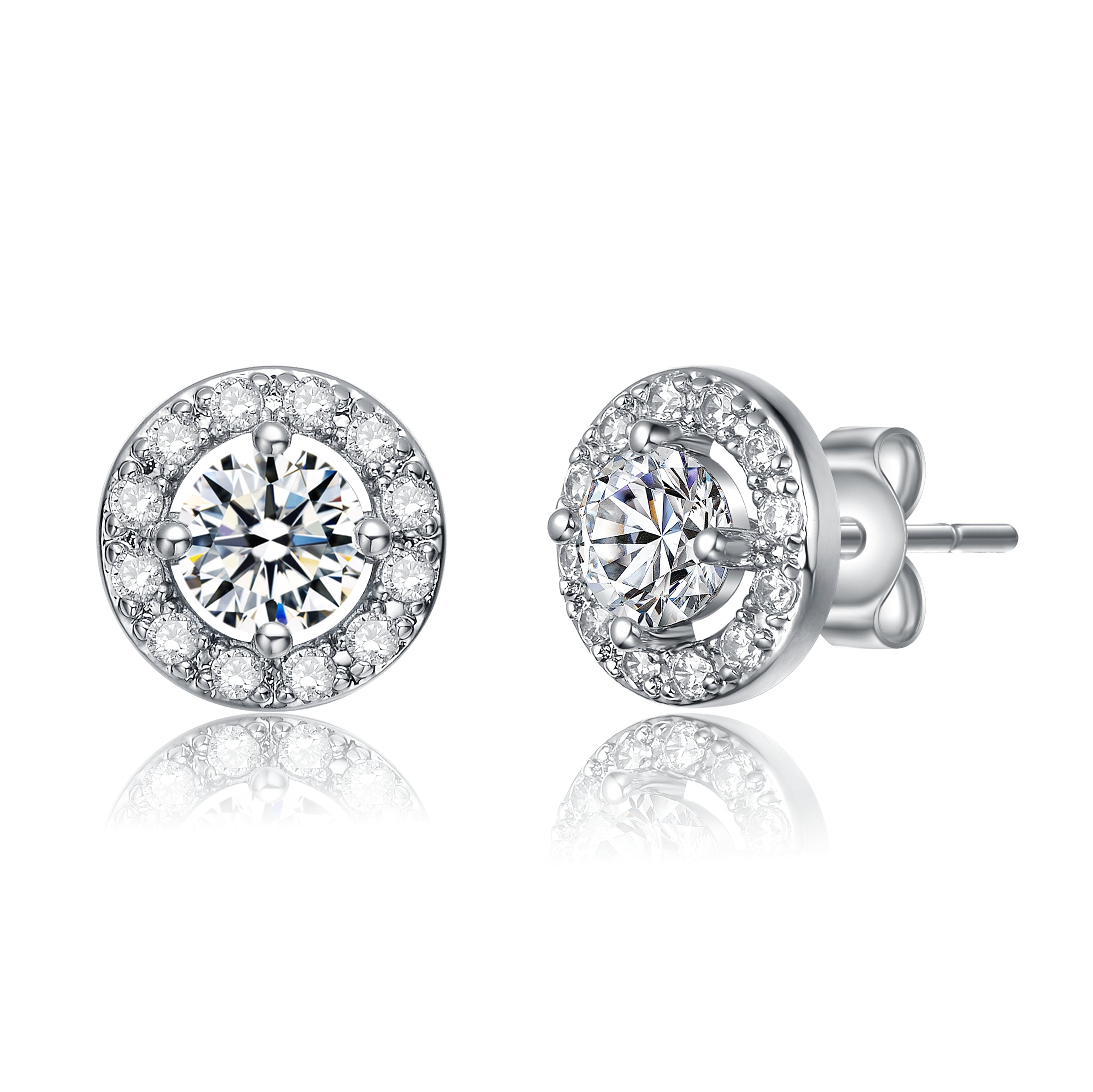 These timeless solitaire halo stud earrings bring classic sparkle to any look. Crafted in .925 sterling silver, they are available in both 14K Gold-plated and Silver finishes. Each stud features a brilliant round cubic zirconia in a secure four-prong setting, surrounded by a halo of pave-set stones for added shimmer. Finished with butterfly backs for comfortable, secure wear.