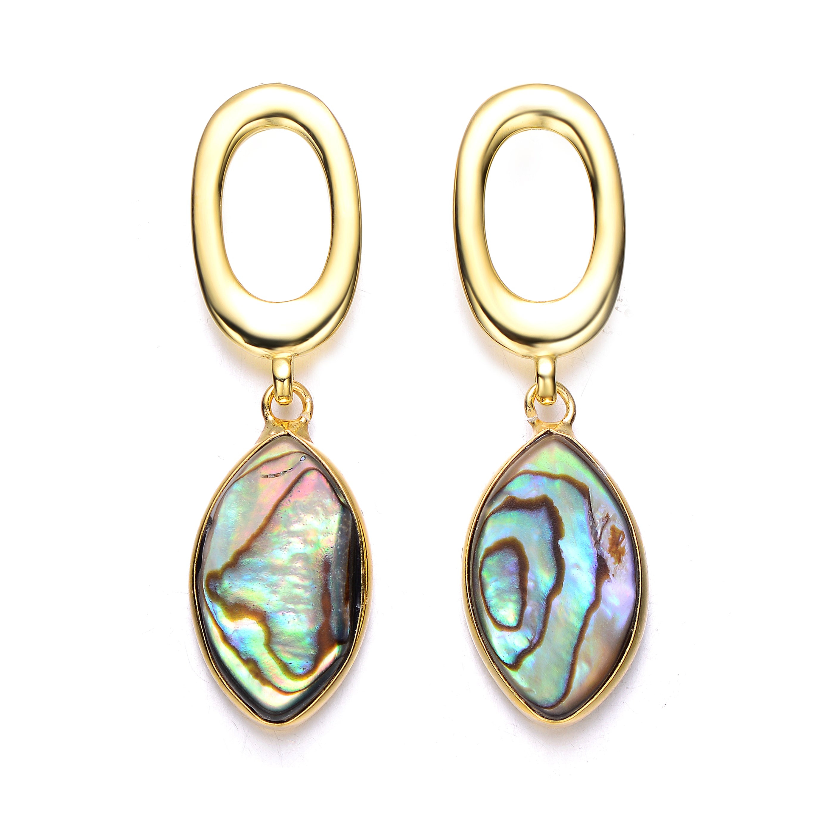 Featuring graceful curves and vibrant abalone shell inlays, these drop earrings bring natural beauty and refined elegance together. Crafted in sterling silver with radiant 14K gold plating, the iridescent hues shimmer effortlessly, making them a versatile accessory for both casual and formal occasions.