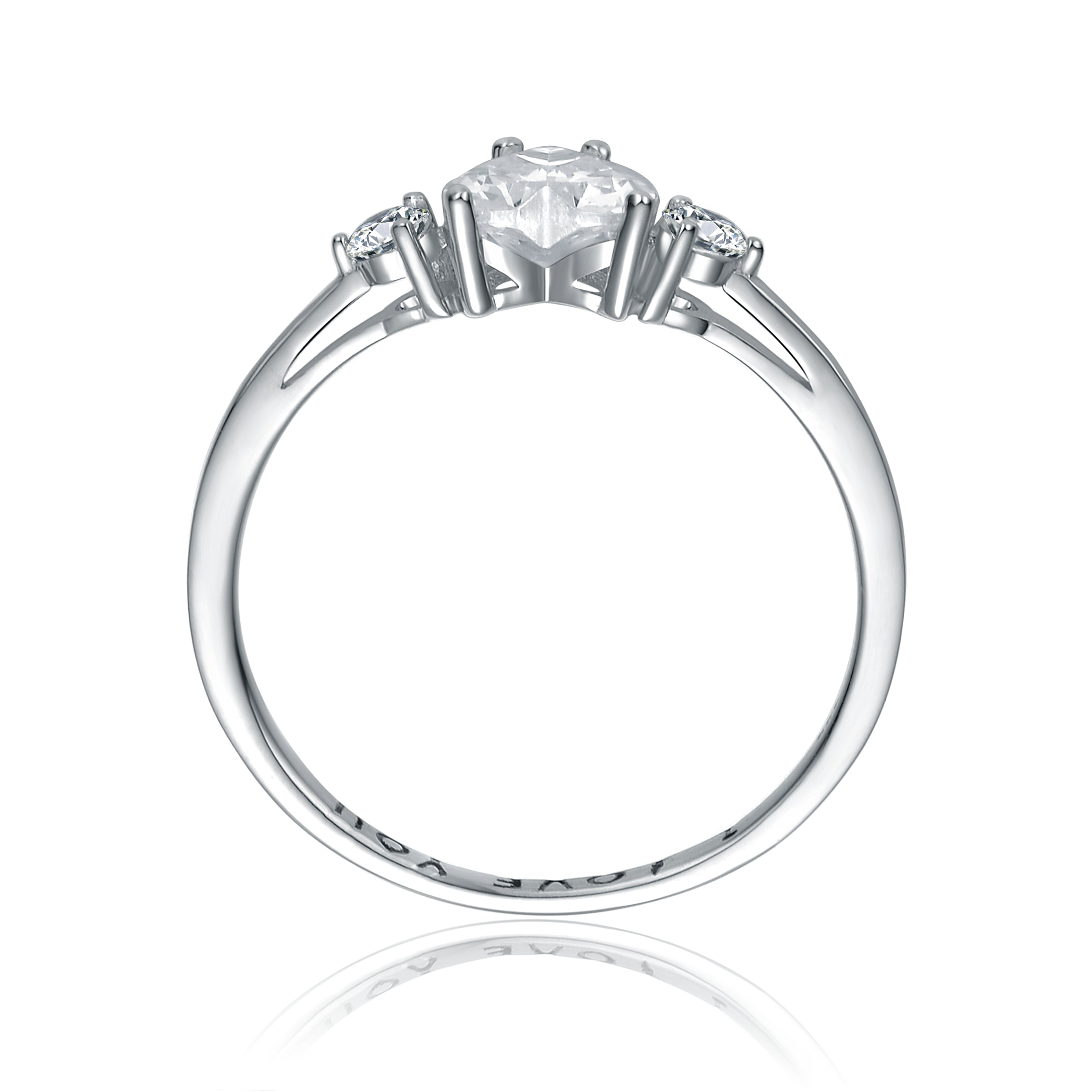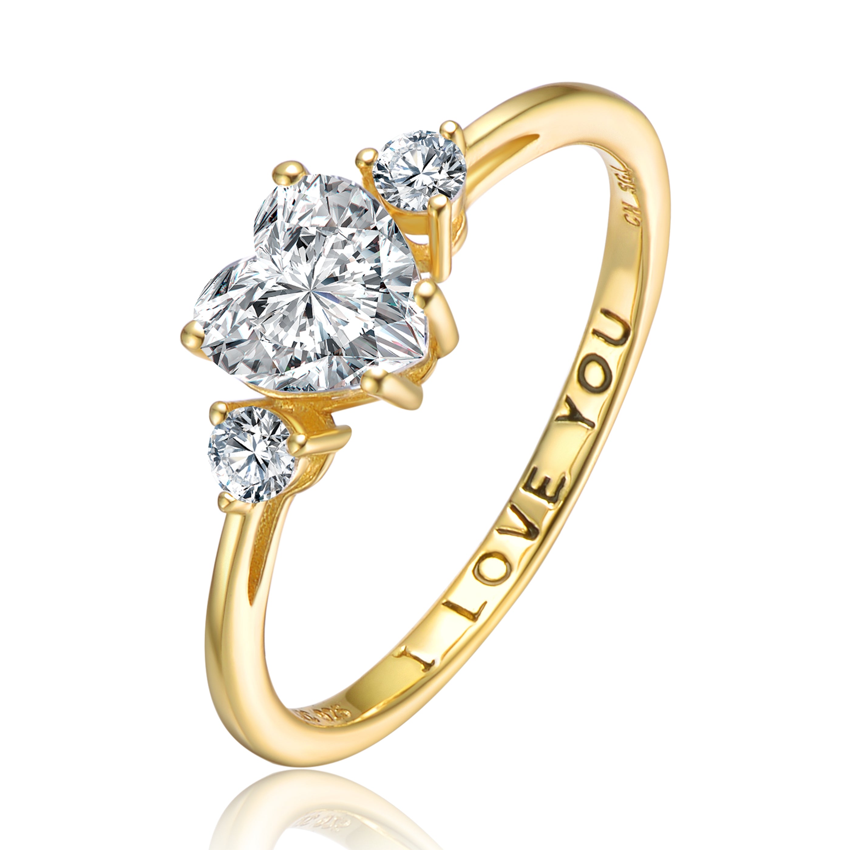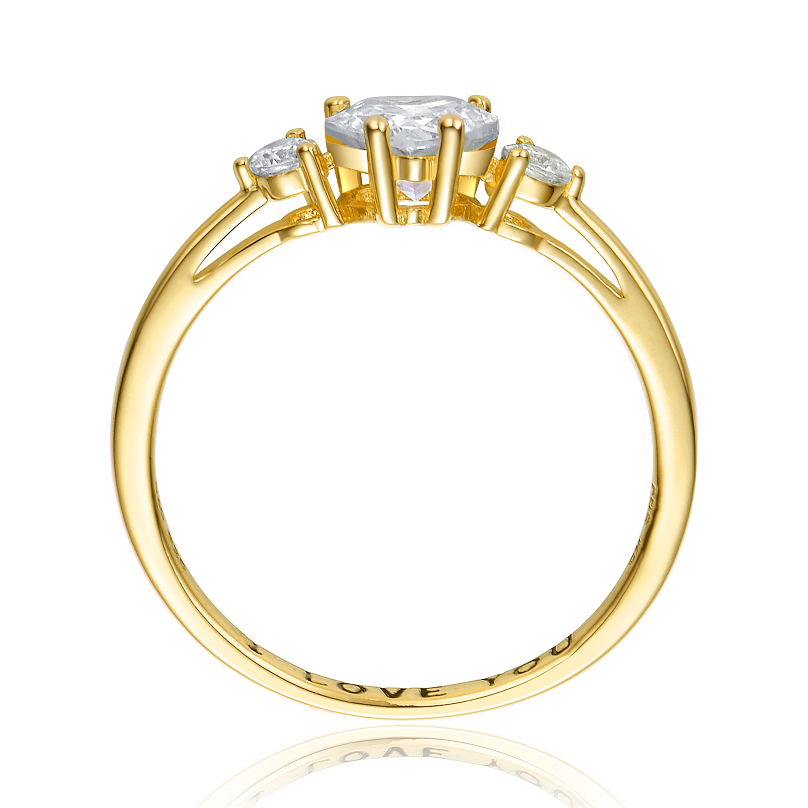 This elegant three-stone ring is crafted from sterling silver with a polished gold-plated finish, offering timeless shine and refined detail. A heart-shaped clear cubic zirconia sits at the center, complemented by clear round cubic zirconia side stones for balanced sparkle. Finished with a smooth, comfortable band, this design features an engraved message on the interior for a distinctive, personal touch.