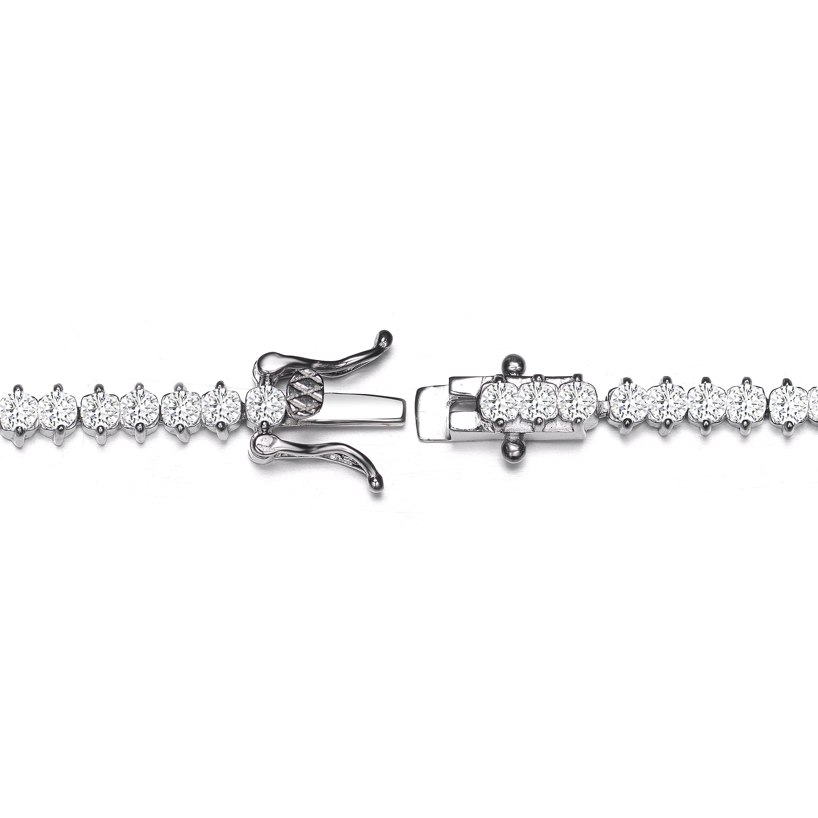 This classic tennis bracelet features clear round cubic zirconia set in .925 Sterling silver with rhodium plated. This bracelet has a versatile design that can match any outfit and it is secured with a box clasp.