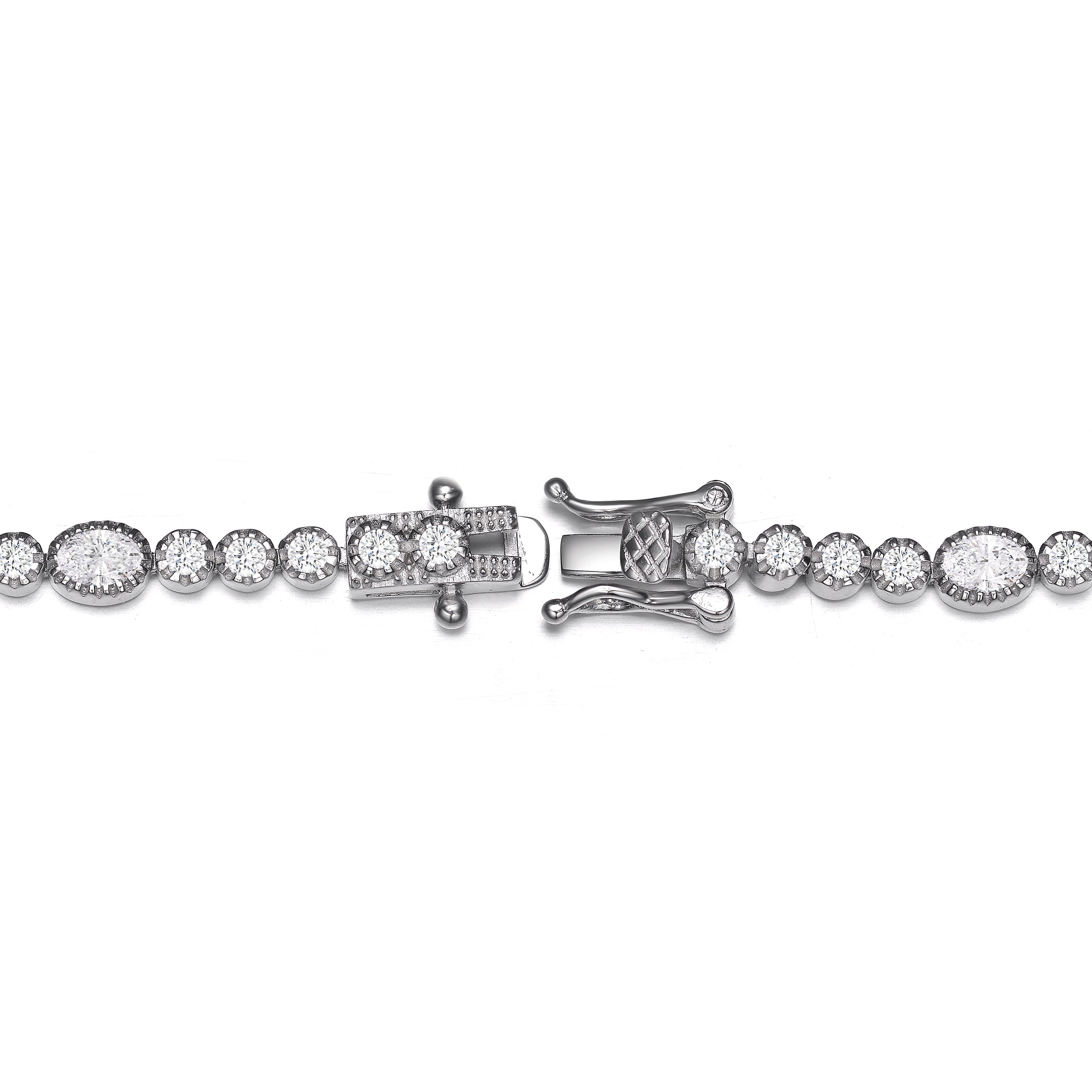 This classic style tennis bracelet features clear round cubic zirconia with clear oval cubic zirconia. This bracelet has a gentle design making it versatile to be worn with any outfit. This is set in .925 Sterling silver with rhodium plated and secures with box clasp.