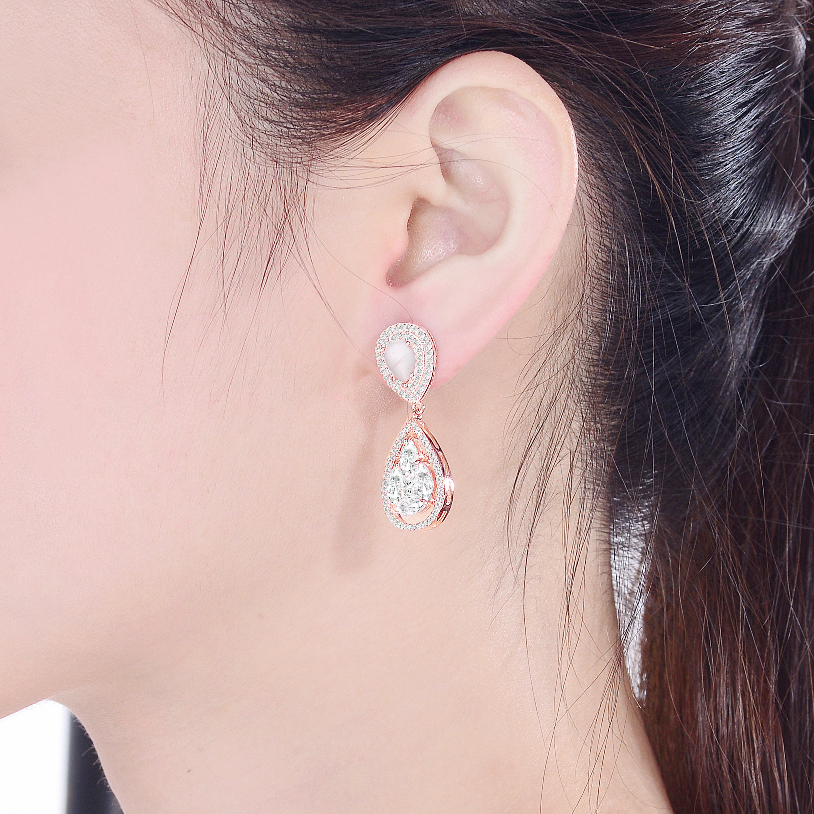 Stylish .925 Sterling silver rose gold plated howlite cubic zirconia halo drop earrings. These earrings features large pear howlite stones accented by small clear round cubic zirconia stones. Crafted of .925 Sterling silver in rose gold plating and secure with butterfly closure.