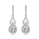 Dangling from these gorgeous earrings are dazzling clear pear Cubic Zirconia with a halo of small clear round Cubic Zirconia and an open pear shape accent outlined with clear round Cubic Zirconia set in Sterling silver with Rhodium plated these earrings secure with butterfly clasp.