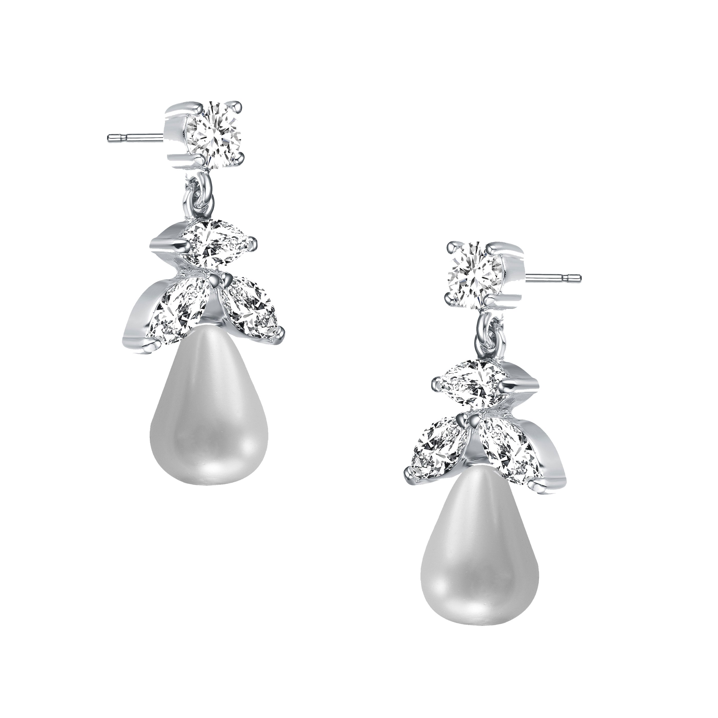 Simply perfect these Freshwater Pearl earrings will complement any outfit on any occasion. Each set features a white round pearl drop accentuated with clear marquise and round Cubic Zirconia to add sparkle. These earrings are set in Sterling silver with Rhodium plated and secures with butterfly clasp.