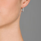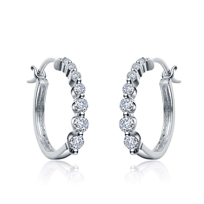 Stylish .925 Sterling silver cubic zirconia bezel hoop earrings. These hoop earrings feature graduated round cut clear cubic zirconia stones along the front. Crafted of .925 Sterling silver in rhodium plating and secure with saddleback clasp.