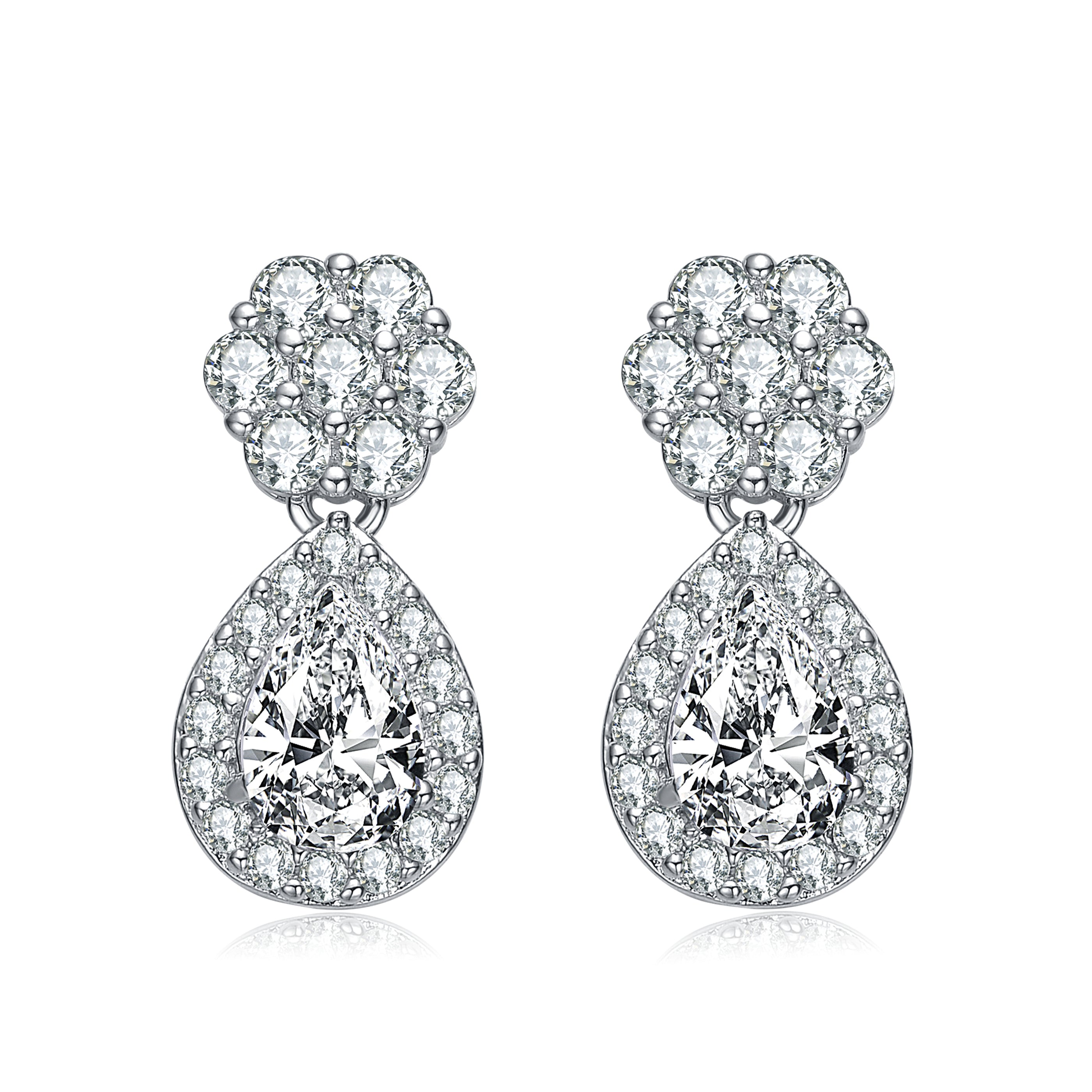 These pretty drop earrings feature a large drop of clear pear cubic zirconia with a halo of clear round cubic zirconia. The earrings post is a cluster of clear round cubic zirconia that forms a flower. Crafted of .925 Sterling silver with rhodium plated these earrings are secure with butterfly clasp.