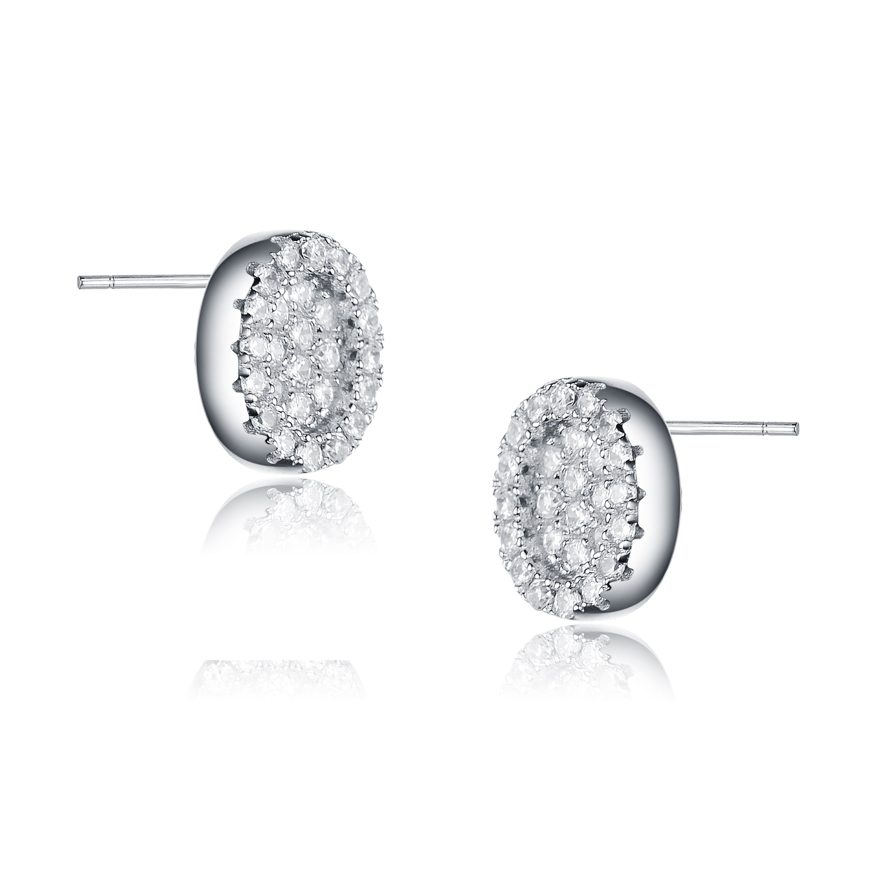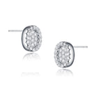 Stylish .925 Sterling silver cubic zirconia pave stud earrings. These button earrings have clear round cubic zirconia stones paved on the oval frame. Crafted of .925 Sterling silver these earrings secure with butterfly closure.