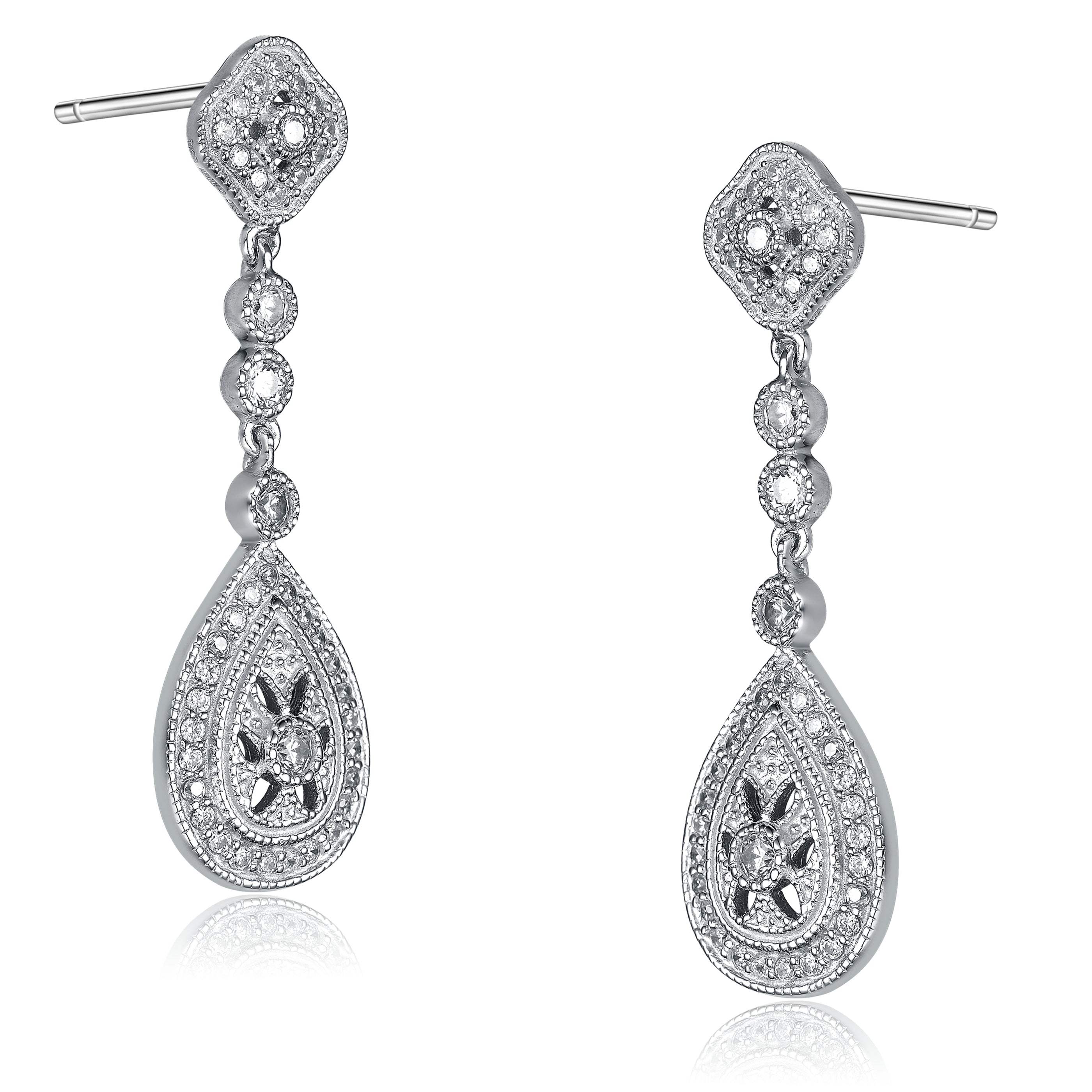 Elegant .925 Sterling silver cubic zirconia pear dangle earrings. These earrings feature pear shaped frame on the bottom studded with clear round cubic zirconia as well as clear round cubic zirconia stones at the top. Crafted of .925 Sterling silver with rhodium plating and secure with butterfly closure.