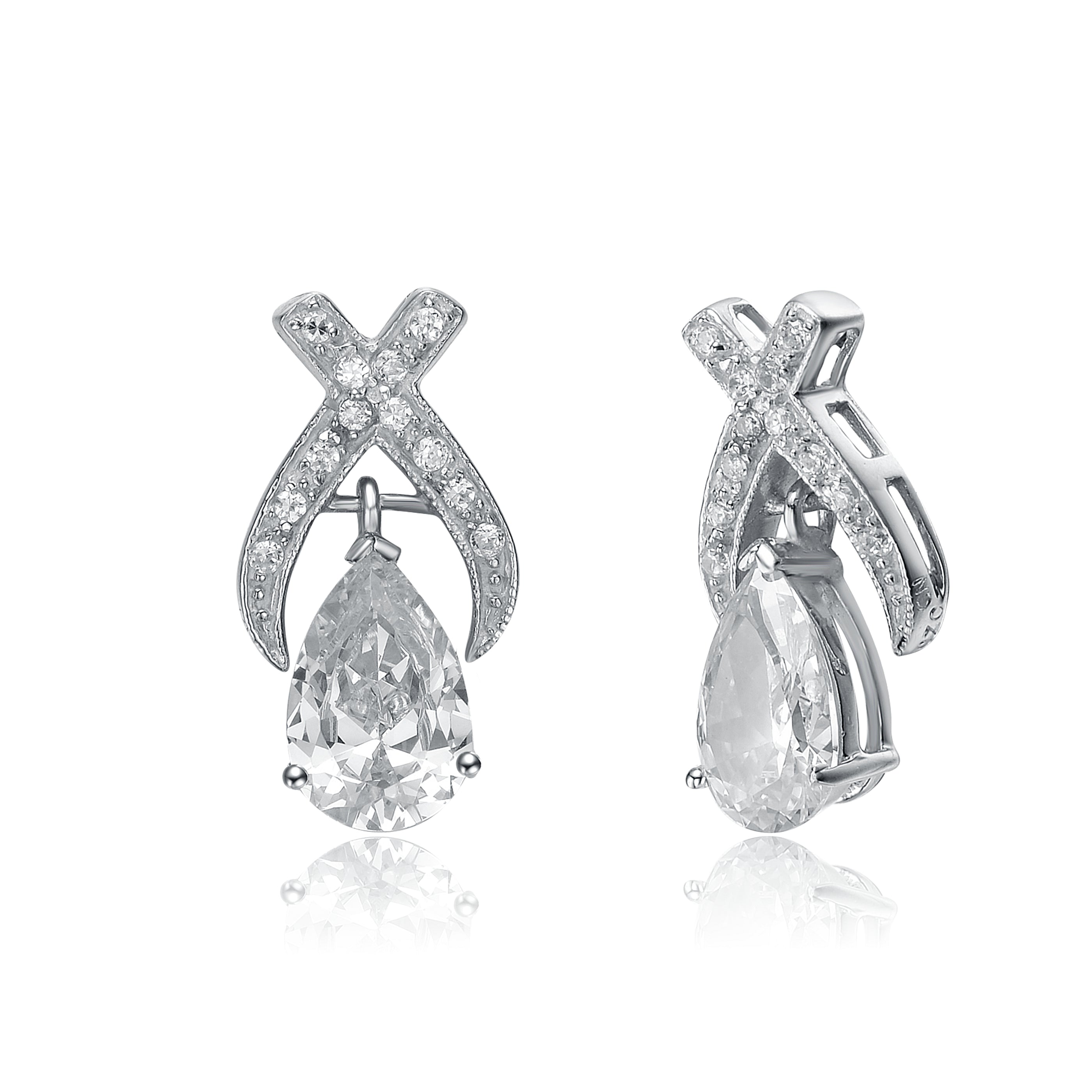 Stylish .925 Sterling silver cubic zirconia pear stud earrings. These feature a pear cut cubic zirconia dangle below a shimmering 'x' design paved with clear round cubic zirconia stones. Crafted of .925 Sterling silver with rhodium plating and secure with a butterfly closure.