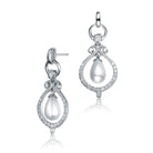 Classy .925 Sterling silver rhodium plated white pearl drop earrings. The design features round frame paved with clear round cubic zirconia stones on the top where it is connected to the post. The bottom part features large pear shaped frame also paved with clear round cubic zirconia stone and one drop pearl in the center. Crafted of .925 Sterling silver with rhodium plating and secure with butterfly closure.