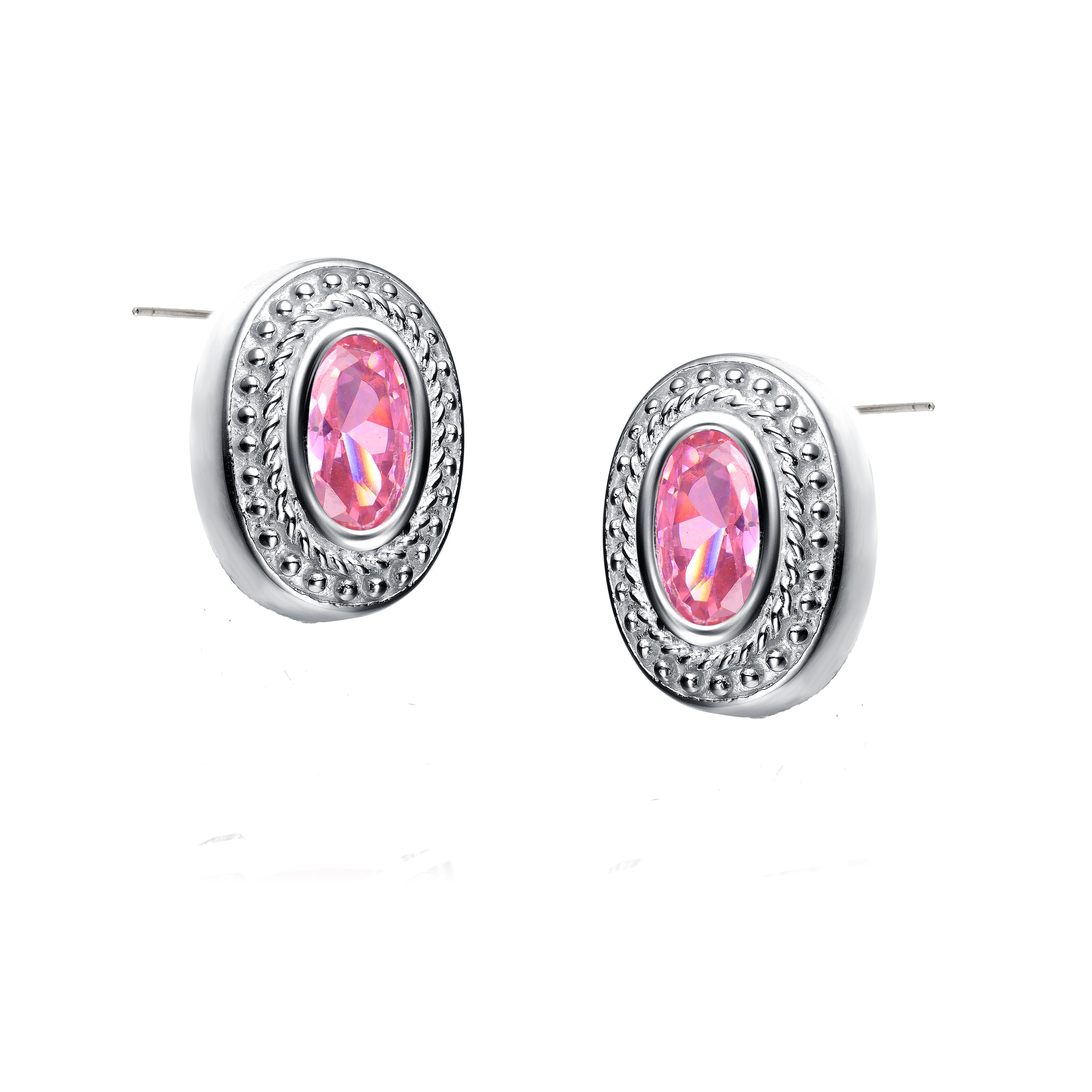 Stylish .925 Sterling silver cubic zirconia stud earrings. These earrings feature sparkling pink cubic zirconia set in a .925 Sterling silver decorative bezel. Crafted of .925 Sterling silver with rhodium plating and secure with butterfly closure.