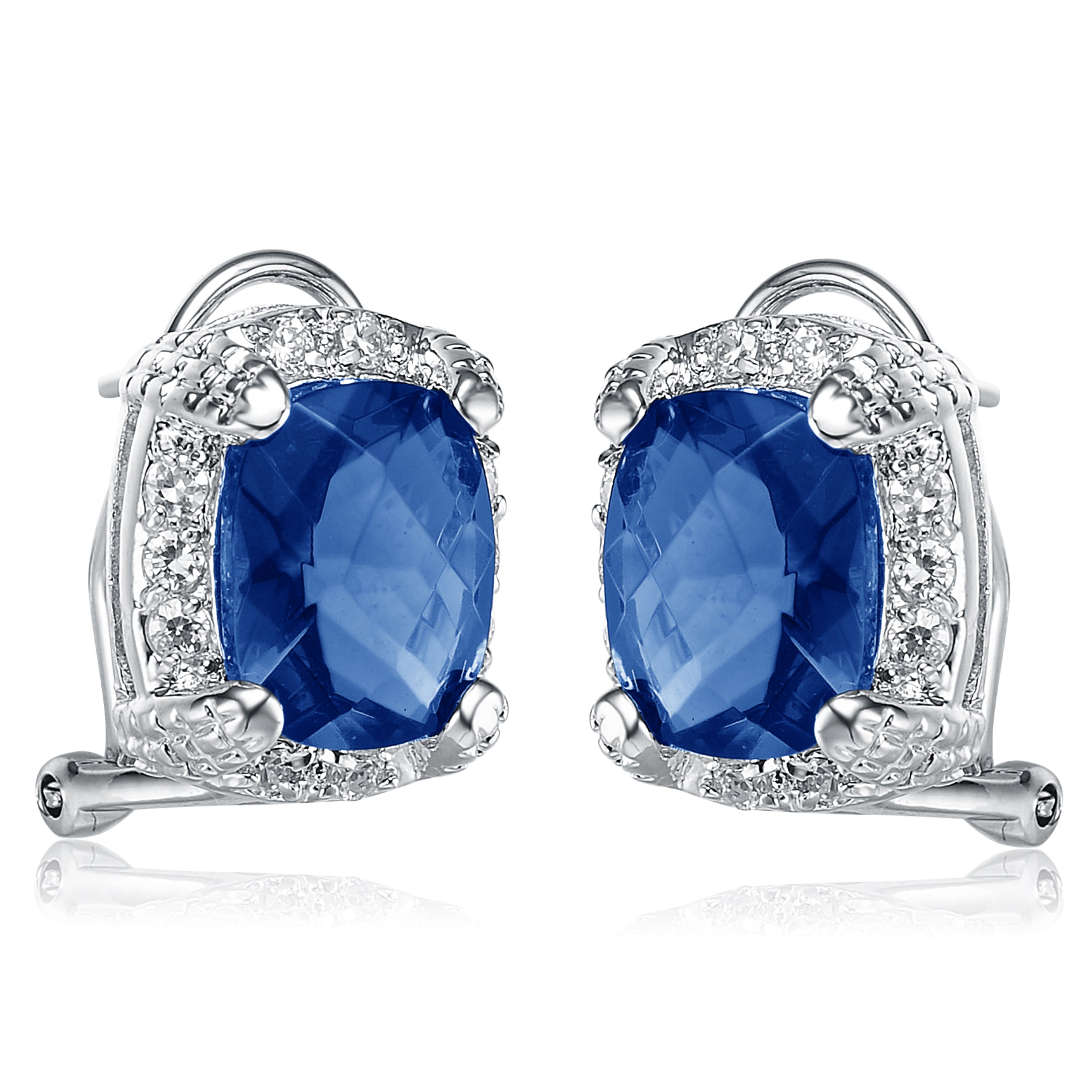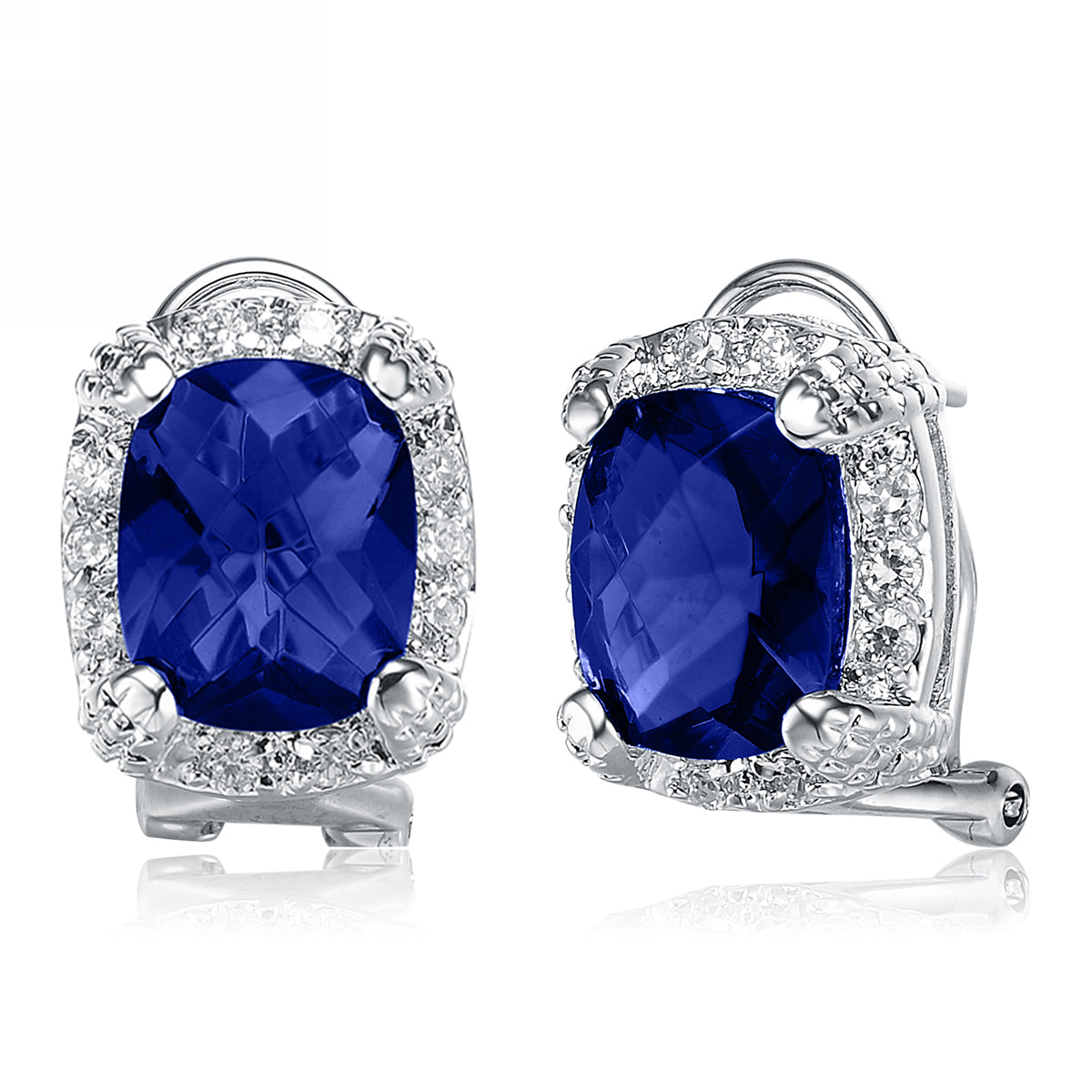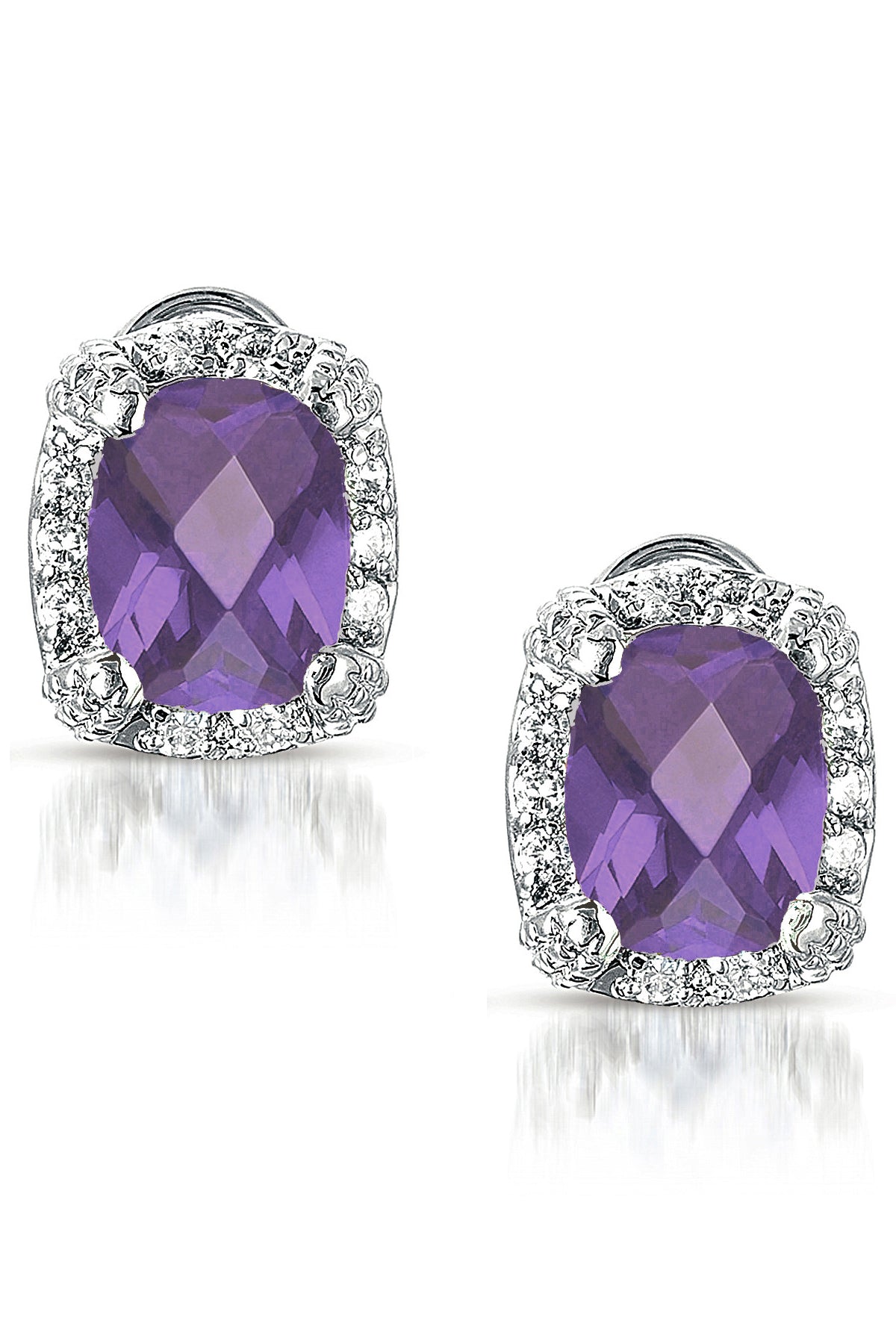 These stunning earrings feature a vibrant center stone in your choice of Ruby, Silver, Emerald, Lavender, or Sapphire cubic zirconia, each surrounded by a brilliant halo of sparkling clear stones. Crafted in .925 sterling silver with a rhodium-plated finish, they offer a radiant, eye-catching look and secure comfortably with butterfly backs.