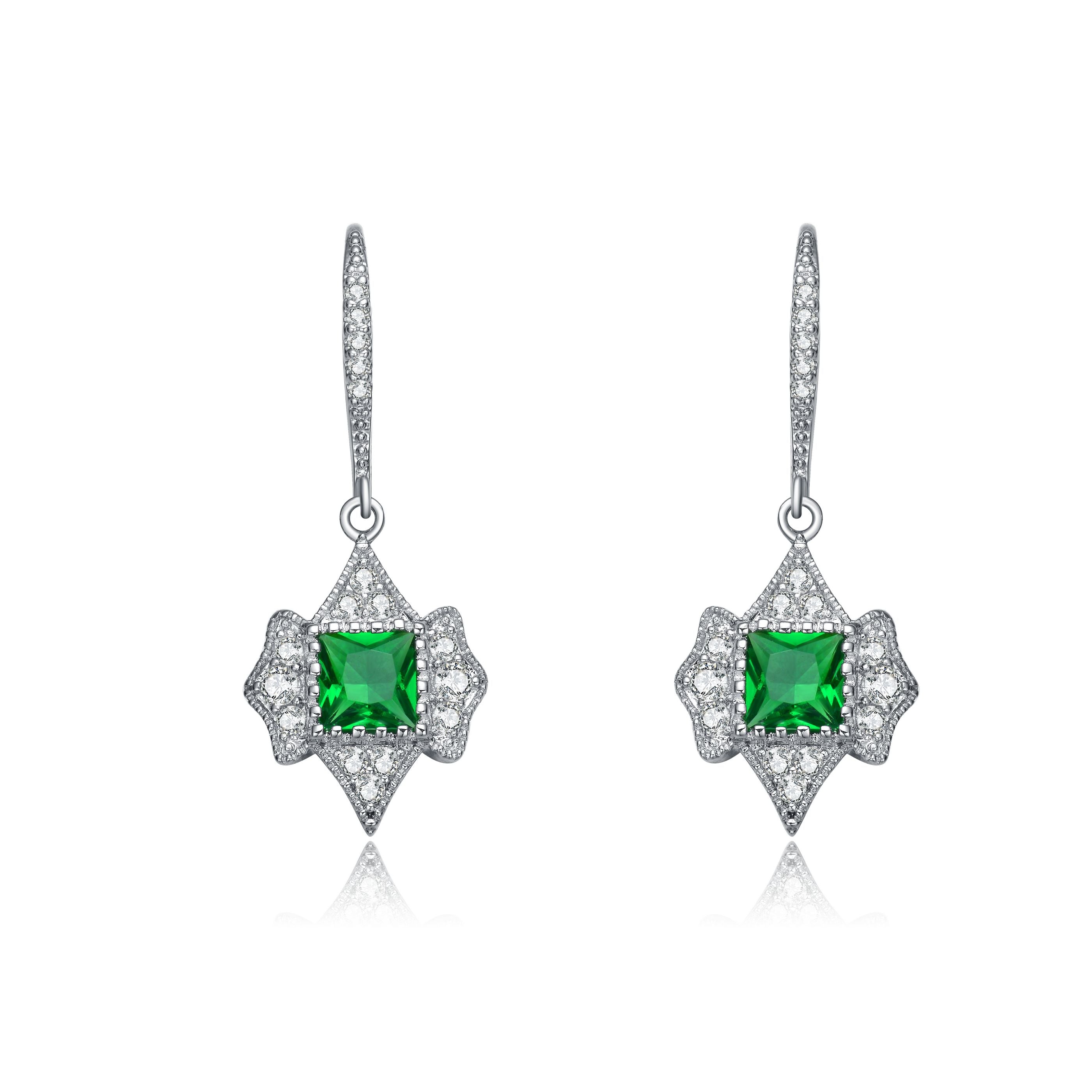 These beautiful leverback earrings are sure to add glam to your daily outfit. It is crafted in Sterling silver with Rhodium plated. The fine curvy bow tie design is formed using three clear round Cubic Zirconia on each side surrounding the center princess Cubic Zirconia stone. Emerald green color on silver base is combination that is artfully done to add elegance to any outfit. This item secures with leverback closure.