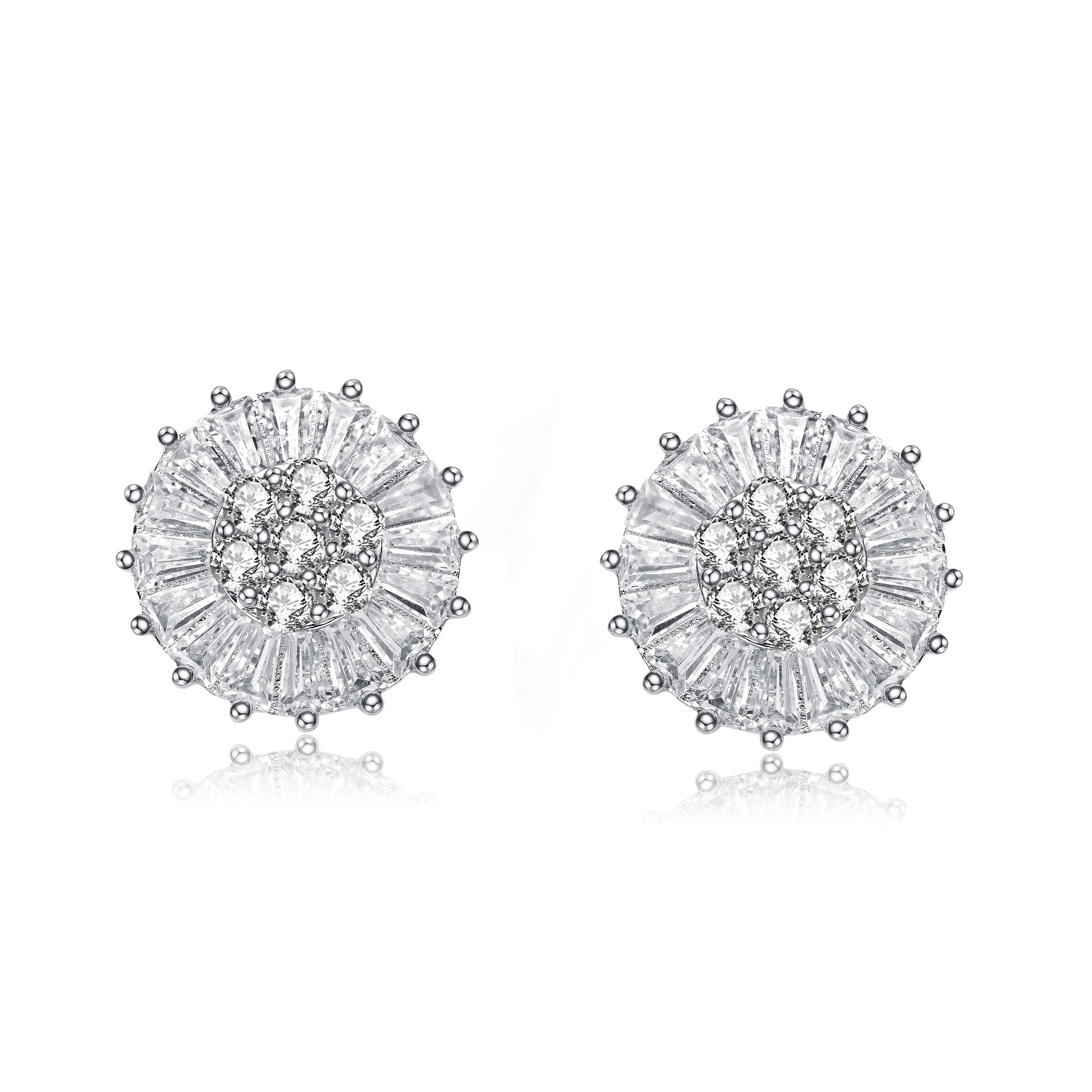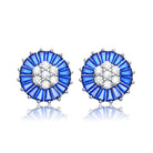 Add dose of glam wearing these eleagant Earrings. The simple design is formed using clear round Cubic Zirconia as center surrounded with colored baguette Cubic Zirconia on silver base. This pair is crafted in Sterling silver with Rhodium plated and secures with a post Butterfly back. Available in clear and sapphire blue.