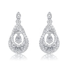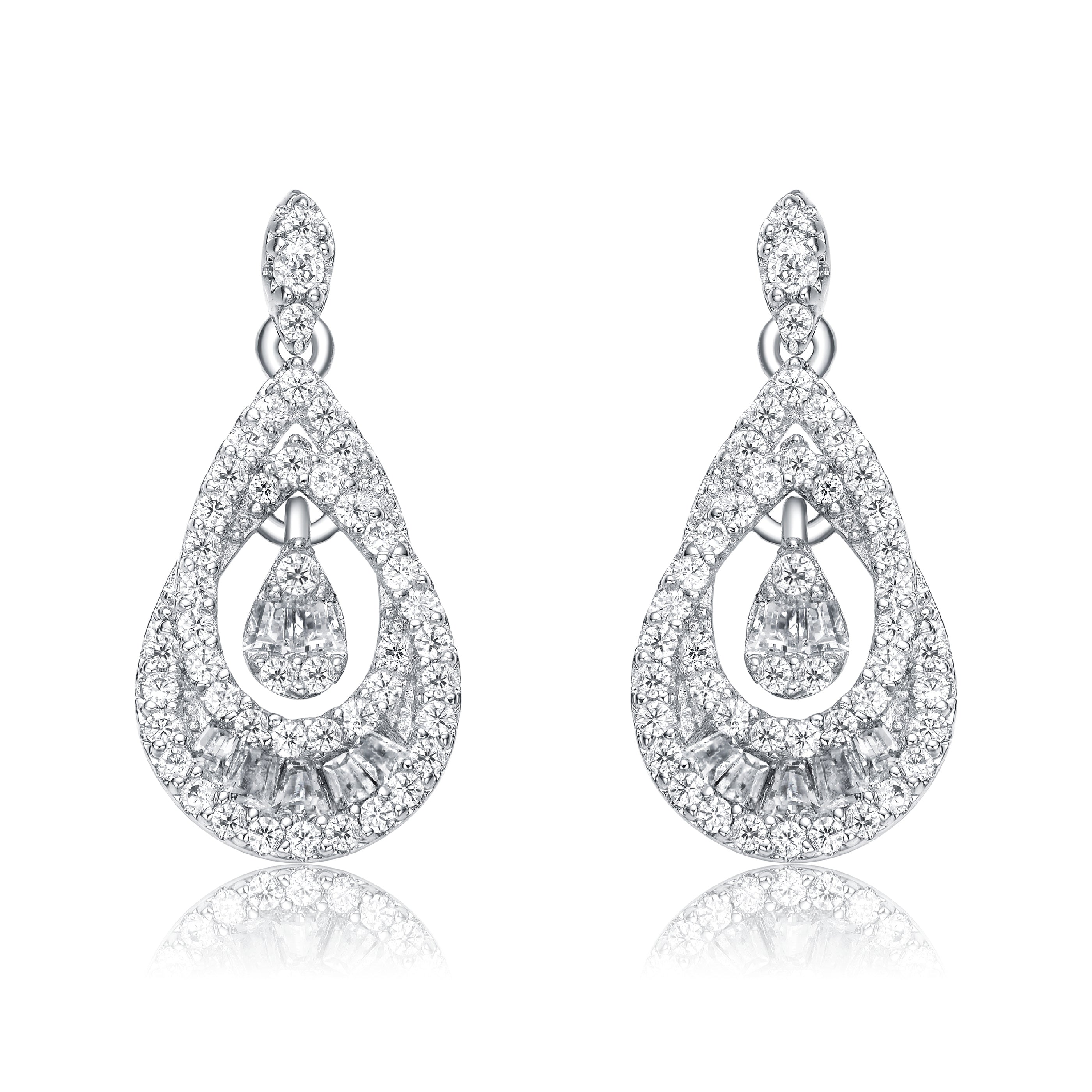 Step out with these fancy .925 Sterling silver earrings. These feature clear baguette and clear round cubic zirconia set on pear shaped frame that overlaps another pear shape frame surrounding the hanging center frame which is also studded with clear baguette cubic zirconia. This pair of earrings is secured with butterfly clasp.