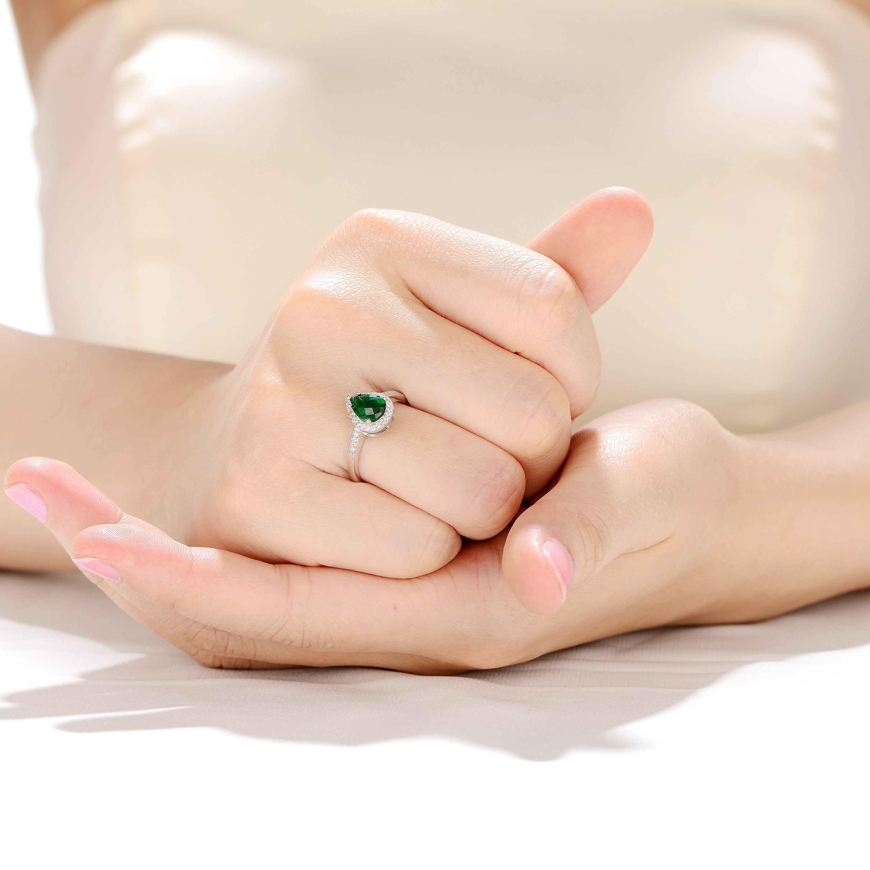 Classy .925 Sterling silver emerald cubic zirconia solitaire ring. This ring will steal the glory with its large, emerald green pear cubic zirconia solitaire. It also features a halo of clear round cubic zirconia accents around the stone and on the band as well. Crafted of .925 Sterling silver with rhodium plating and it is available in sizes 6, 7, 8.