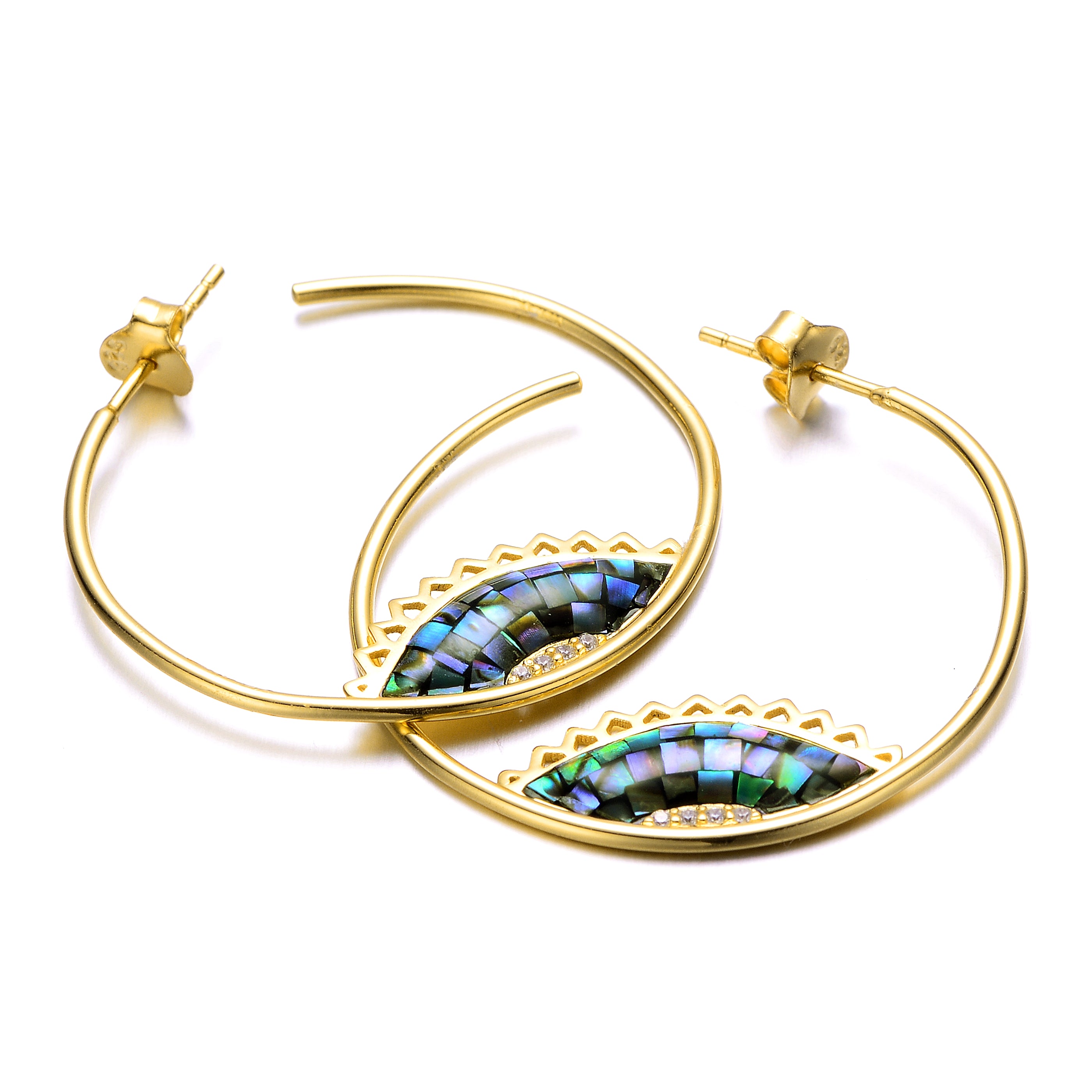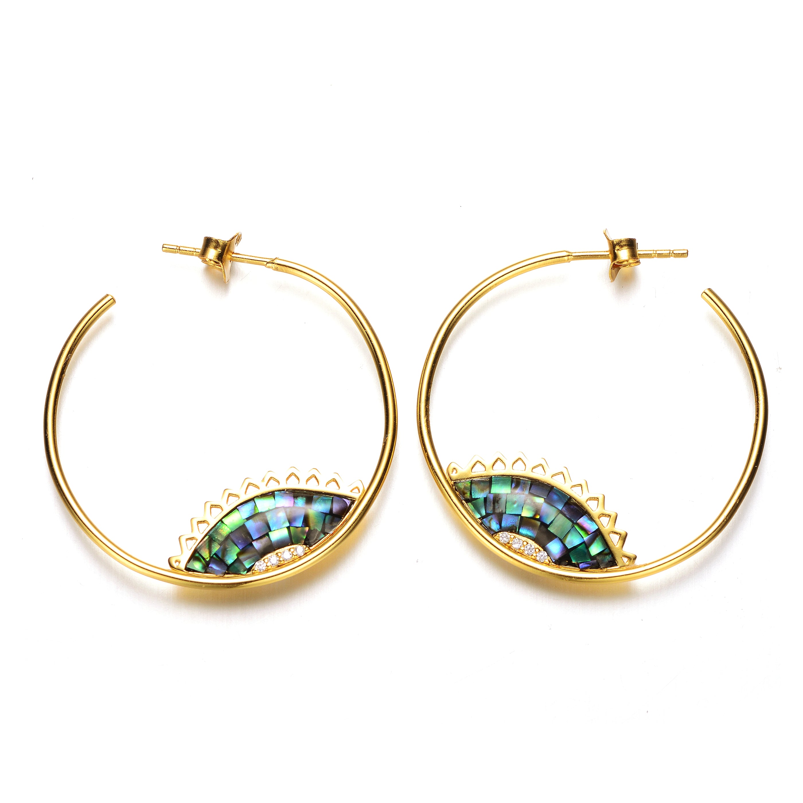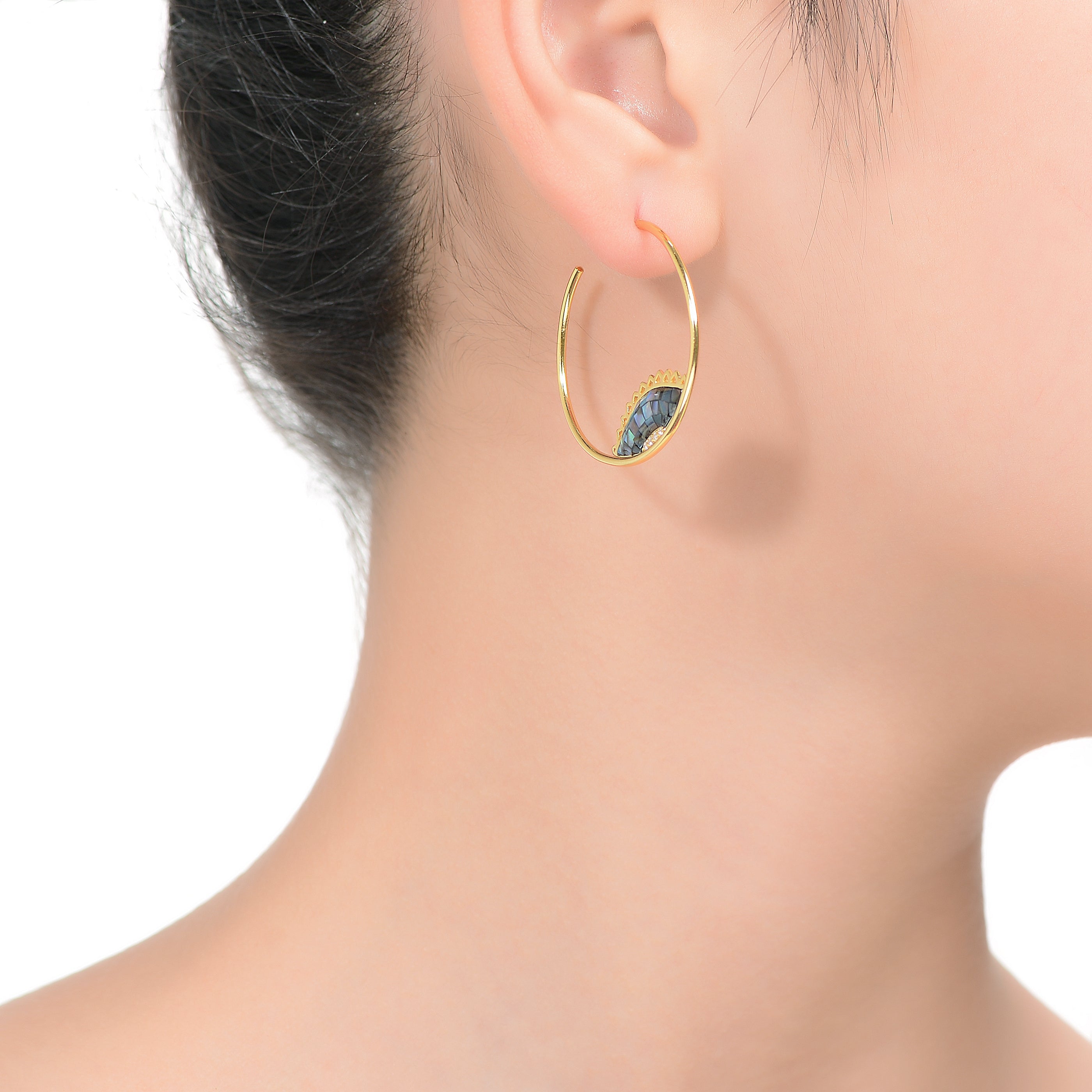 Unleash your inner glow with these exquisite hoop earrings, meticulously crafted from high-quality gold-tone material. Each earring is adorned with a captivating abalone shell inlay, showcasing a mesmerizing blend of oceanic hues that dance and shimmer with every movement. The elegant design is accentuated by the delicate scalloped edging, offering a touch of sophistication and allure. Perfect for elevating any ensemble, these earrings promise to be a cherished addition to every jewelry collection.